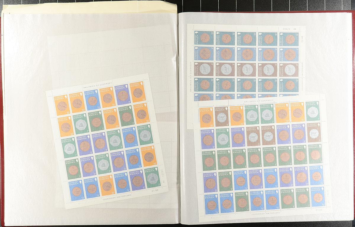 Group of never hinged Channel Islands complete sheets, 1970s-1980s, containing 20 sheets from Isle of Man, and 15 sheets from Guernsey in two sheet files. A spot check indicated gutter sheets, along with traffic light blocks, with a few sheets cataloguing $20 and up. Owner's older catalogue value for the collection totals US$405.00. A few edge faults with a few Guernsey sheets due to the size of the sheets. A nice lot for the sheet collector, overall fine to very fine. Estimate =