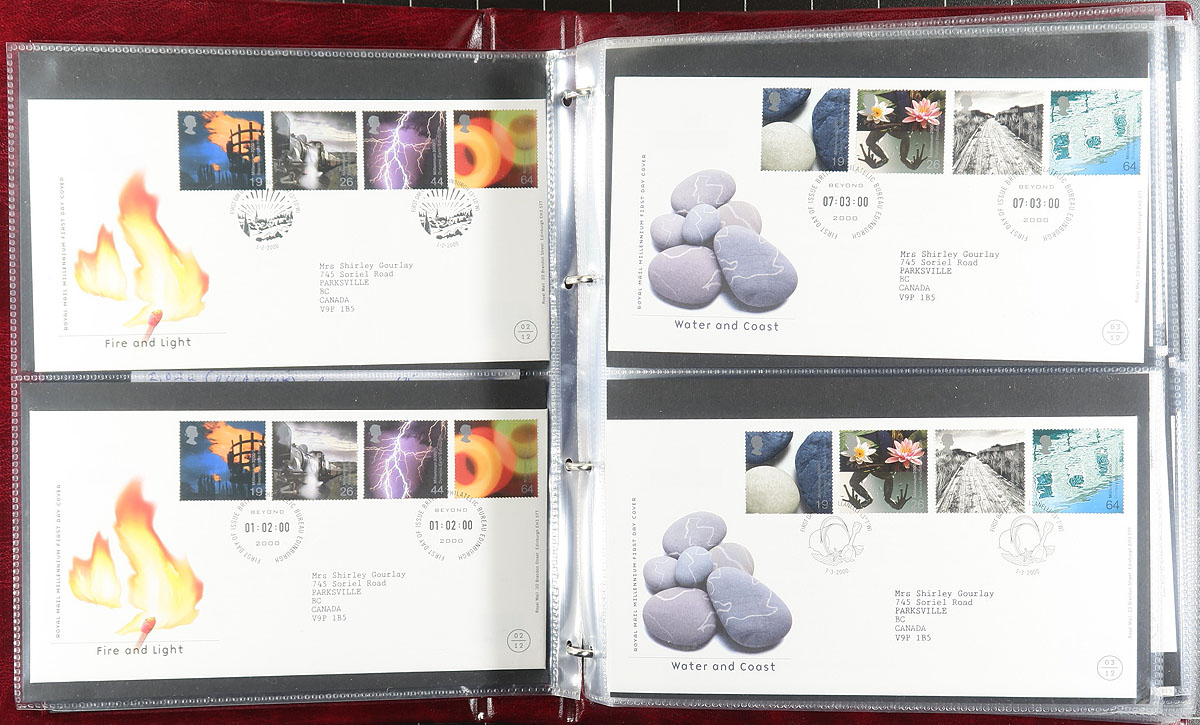 Nice group of just over 200 Great Britain modern first day covers, in 3 Royal Mail First Day Cover albums, 1997-2003, containing primarily sets and a few souvenir sheet frankings, noting a variety of pictorial postmarks throughout. Owner's 2016 Scott catalogue value, counted as used stamps, totals US$1,134.00. A nice clean lot for all collectors. Estimate =
