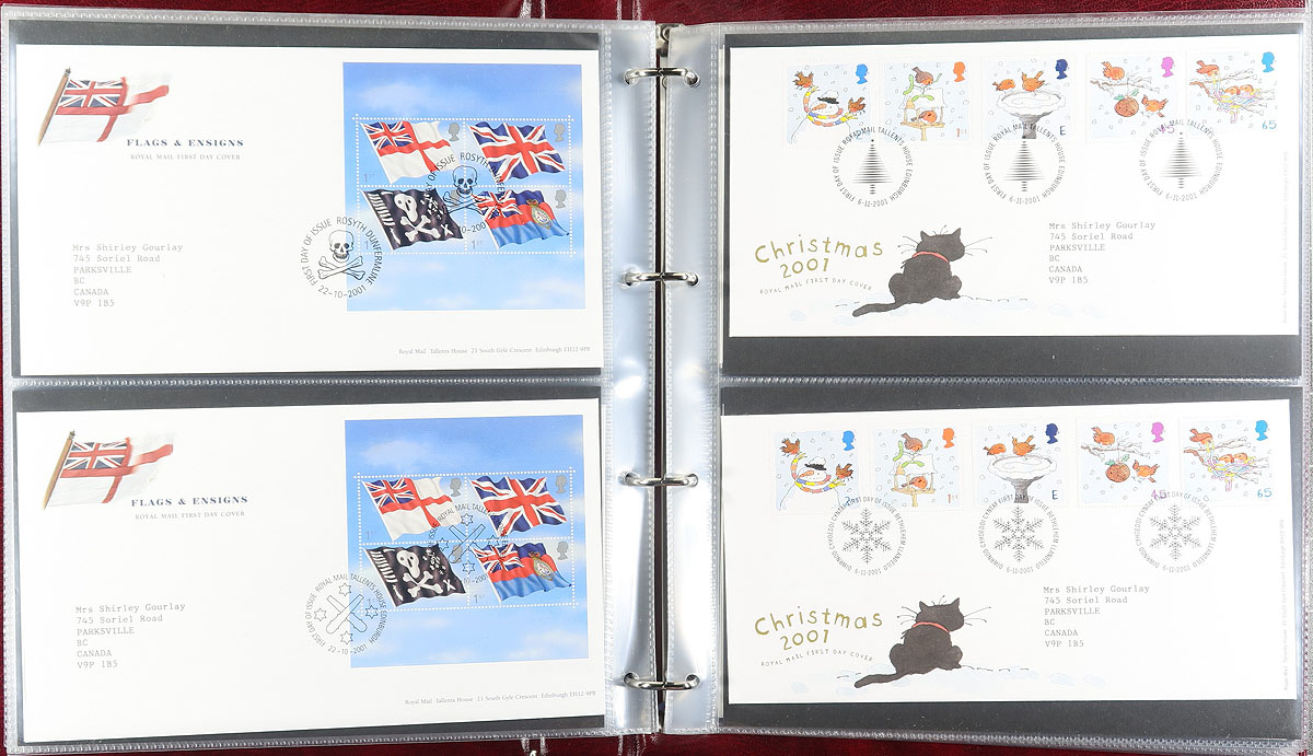Nice group of just over 200 Great Britain modern first day covers, in 3 Royal Mail First Day Cover albums, 1997-2003, containing primarily sets and a few souvenir sheet frankings, noting a variety of pictorial postmarks throughout. Owner's 2016 Scott catalogue value, counted as used stamps, totals US$1,134.00. A nice clean lot for all collectors. Estimate =