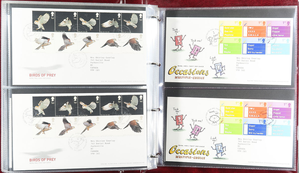 Nice group of just over 200 Great Britain modern first day covers, in 3 Royal Mail First Day Cover albums, 1997-2003, containing primarily sets and a few souvenir sheet frankings, noting a variety of pictorial postmarks throughout. Owner's 2016 Scott catalogue value, counted as used stamps, totals US$1,134.00. A nice clean lot for all collectors. Estimate =