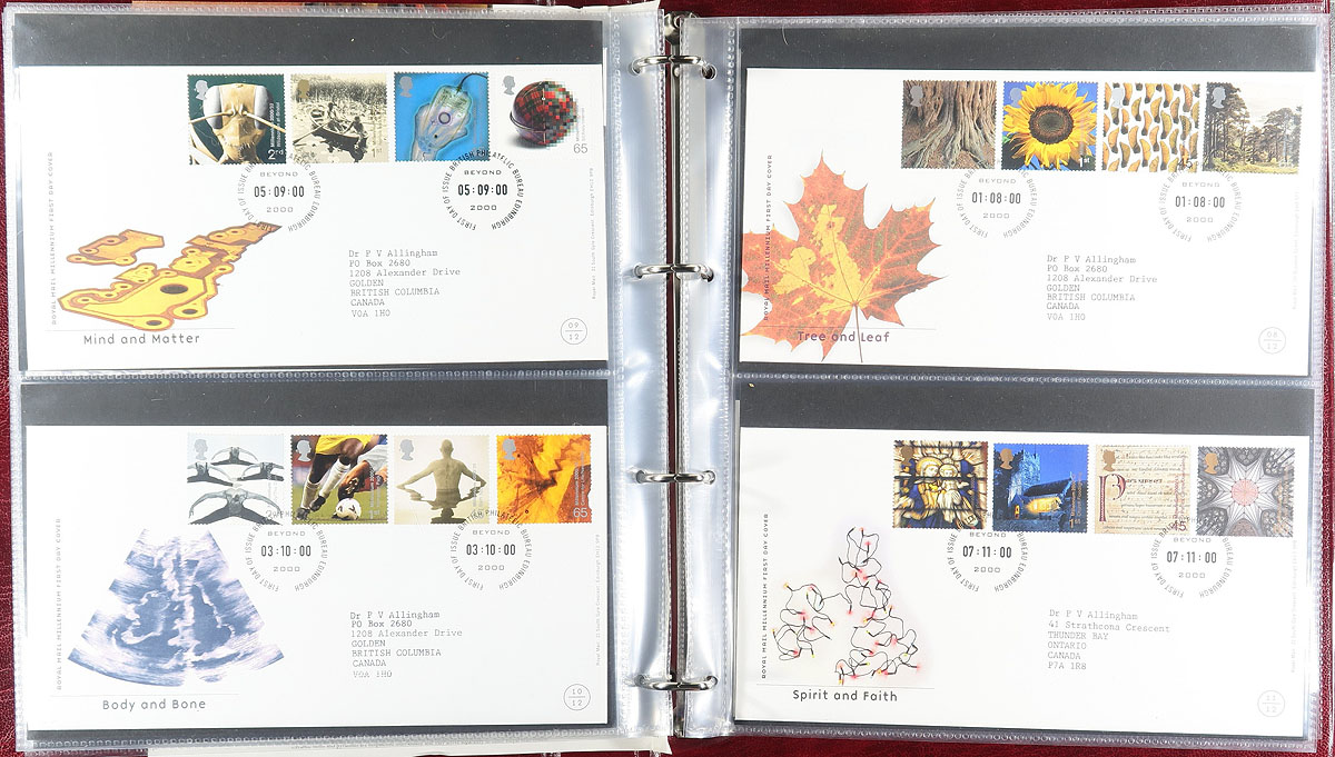 Nice group of just over 200 Great Britain modern first day covers, in 3 Royal Mail First Day Cover albums, 1997-2003, containing primarily sets and a few souvenir sheet frankings, noting a variety of pictorial postmarks throughout. Owner's 2016 Scott catalogue value, counted as used stamps, totals US$1,134.00. A nice clean lot for all collectors. Estimate =