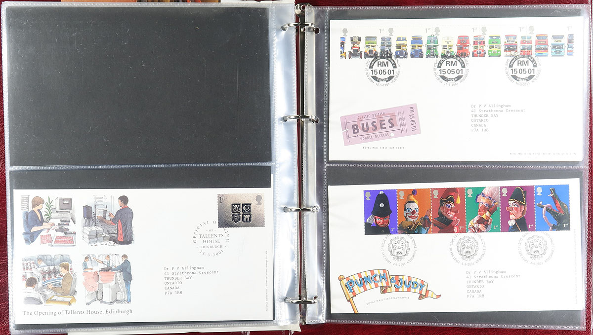 Nice group of just over 200 Great Britain modern first day covers, in 3 Royal Mail First Day Cover albums, 1997-2003, containing primarily sets and a few souvenir sheet frankings, noting a variety of pictorial postmarks throughout. Owner's 2016 Scott catalogue value, counted as used stamps, totals US$1,134.00. A nice clean lot for all collectors. Estimate =