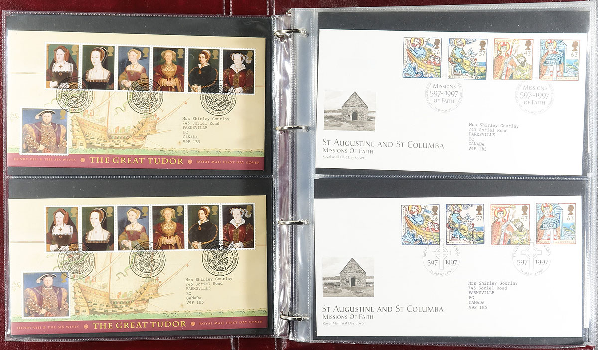 Nice group of just over 200 Great Britain modern first day covers, in 3 Royal Mail First Day Cover albums, 1997-2003, containing primarily sets and a few souvenir sheet frankings, noting a variety of pictorial postmarks throughout. Owner's 2016 Scott catalogue value, counted as used stamps, totals US$1,134.00. A nice clean lot for all collectors. Estimate =