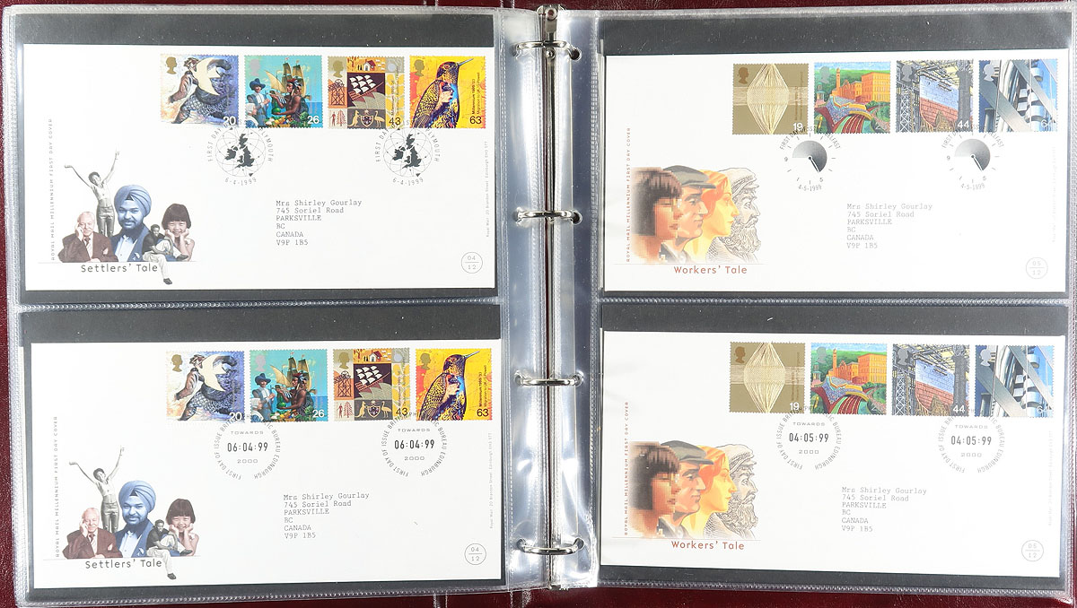 Nice group of just over 200 Great Britain modern first day covers, in 3 Royal Mail First Day Cover albums, 1997-2003, containing primarily sets and a few souvenir sheet frankings, noting a variety of pictorial postmarks throughout. Owner's 2016 Scott catalogue value, counted as used stamps, totals US$1,134.00. A nice clean lot for all collectors. Estimate =