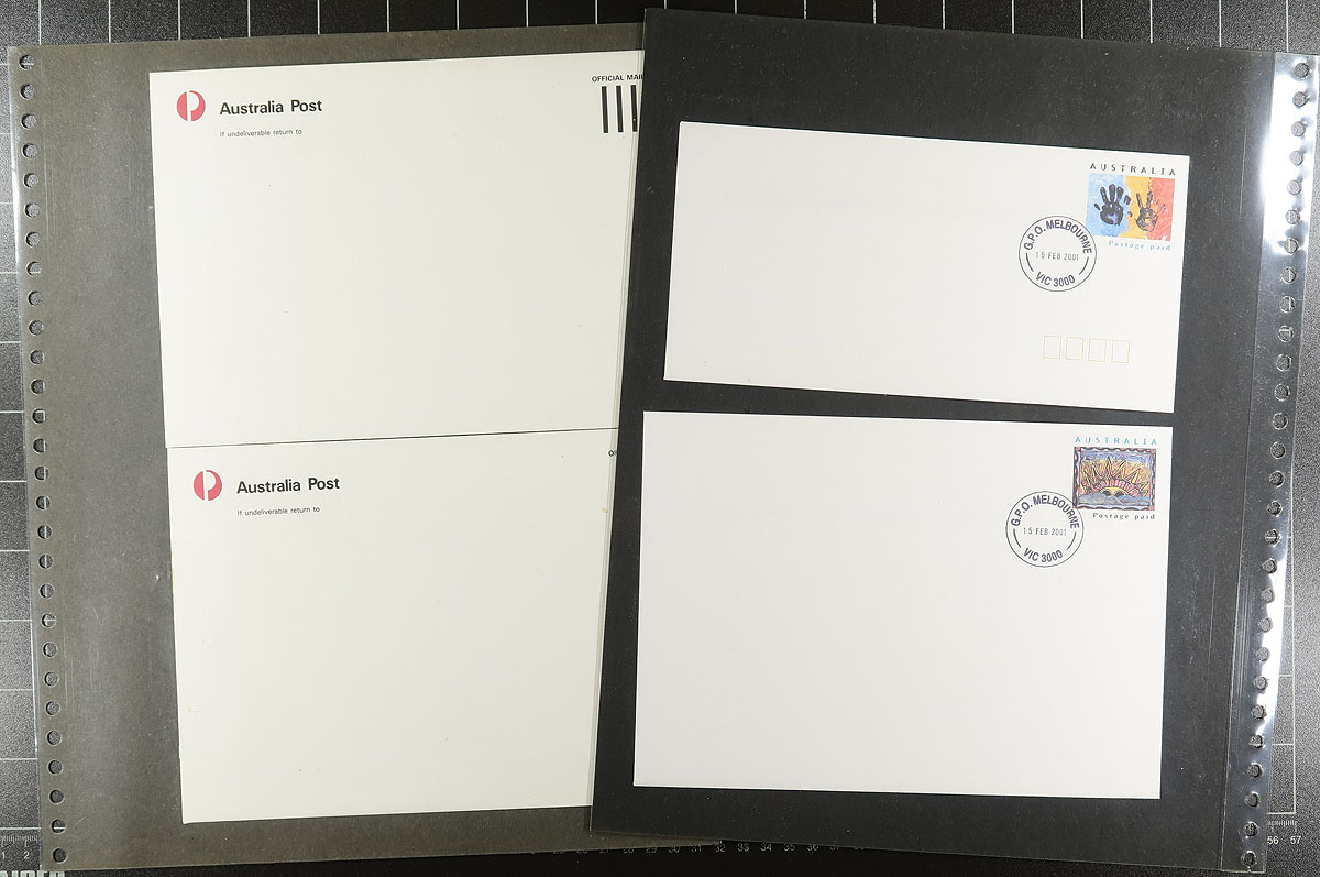 Postal Stationery. Attractive group of roughly 225 primarily unused Australia postal stationery items, generally ranging from the early 1980's to the early 2000's. We note denominations ranging from 20c to 50c, along with a few "Postage Paid" examples, including a mint and a first day of use example for some issues. We estimate face value in the $50 to $100 range. A nice clean lot for the postal stationery or Australia specialist. Estimate =