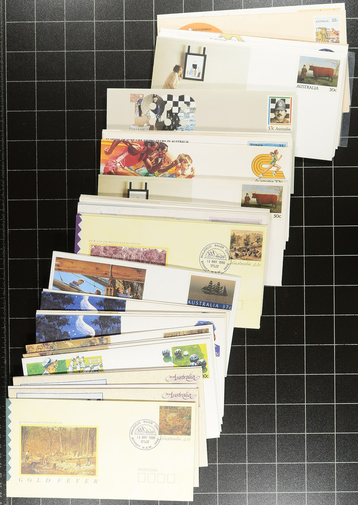 Postal Stationery. Attractive group of roughly 225 primarily unused Australia postal stationery items, generally ranging from the early 1980's to the early 2000's. We note denominations ranging from 20c to 50c, along with a few "Postage Paid" examples, including a mint and a first day of use example for some issues. We estimate face value in the $50 to $100 range. A nice clean lot for the postal stationery or Australia specialist. Estimate =