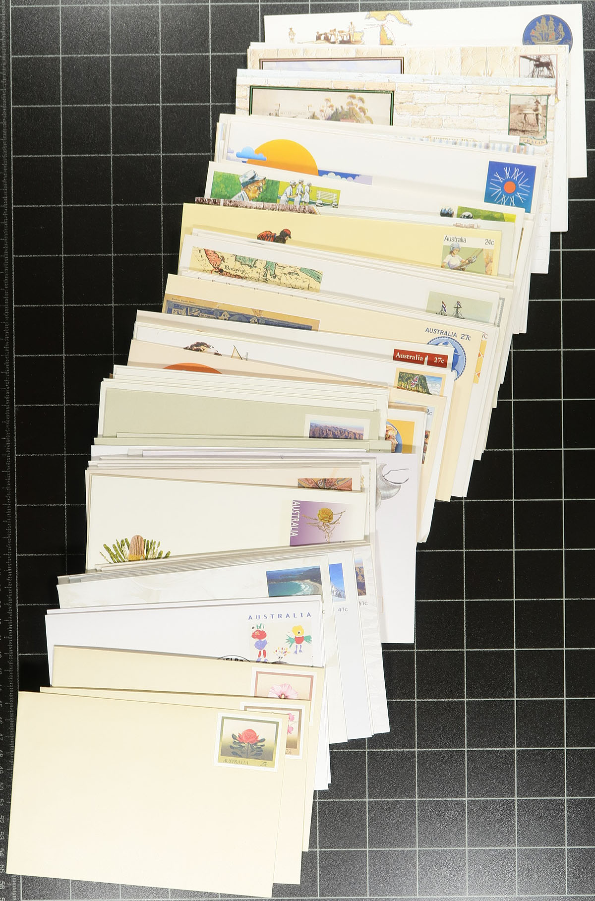 Postal Stationery. Attractive group of roughly 225 primarily unused Australia postal stationery items, generally ranging from the early 1980's to the early 2000's. We note denominations ranging from 20c to 50c, along with a few "Postage Paid" examples, including a mint and a first day of use example for some issues. We estimate face value in the $50 to $100 range. A nice clean lot for the postal stationery or Australia specialist. Estimate =