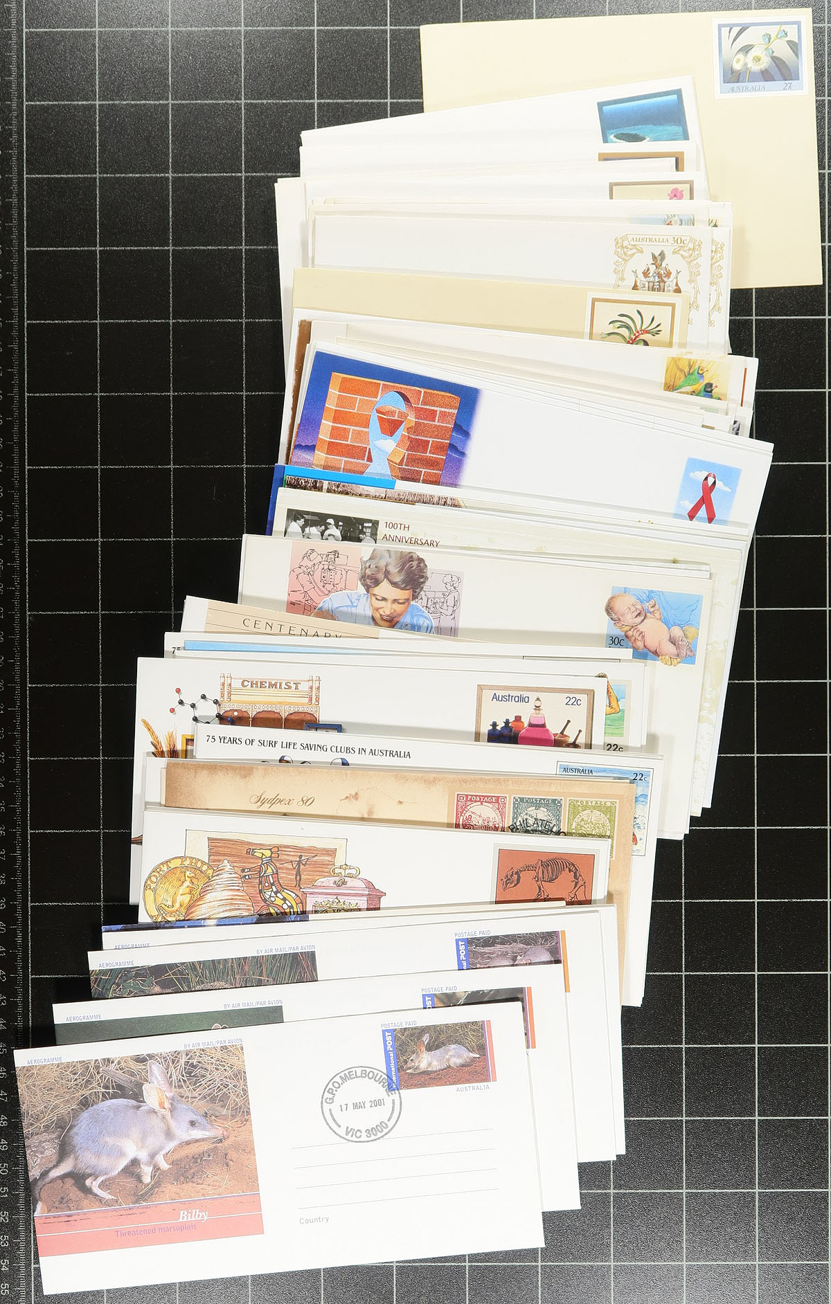 Postal Stationery. Attractive group of roughly 225 primarily unused Australia postal stationery items, generally ranging from the early 1980's to the early 2000's. We note denominations ranging from 20c to 50c, along with a few "Postage Paid" examples, including a mint and a first day of use example for some issues. We estimate face value in the $50 to $100 range. A nice clean lot for the postal stationery or Australia specialist. Estimate =