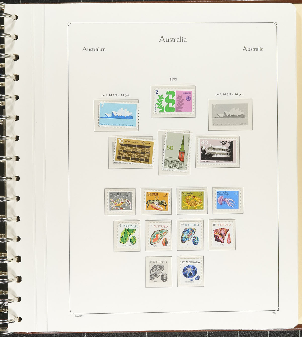 Collection in 5 hingeless KA-BE albums with slipcase. The star attraction are the albums, with hingeless pages ranging from 1913-1999, including spots for souvenir sheets and panes, and includes pages for Antarctica ranging from 1957 to 1999. The lot includes many hundreds of stamps, including a few used Kangaroos, and partially used sets up to the 1970's, along with scattered never hinged sets up to the early 1990's. We estimate face value material to be in the $80 to $100 range. A good starter collection in worthy albums that would have originally cost $1,000 in a retail environment. Estimate =
