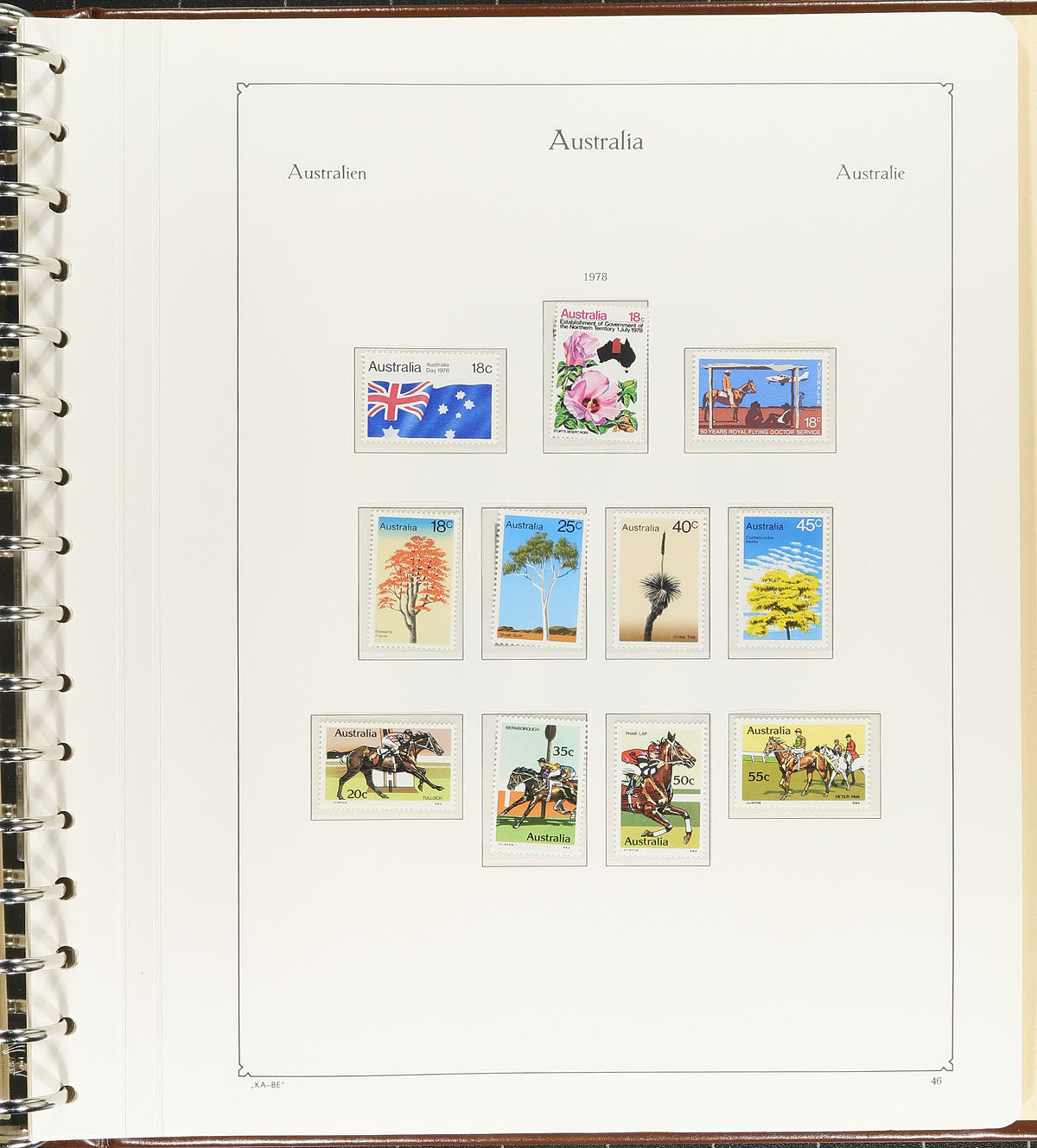 Collection in 5 hingeless KA-BE albums with slipcase. The star attraction are the albums, with hingeless pages ranging from 1913-1999, including spots for souvenir sheets and panes, and includes pages for Antarctica ranging from 1957 to 1999. The lot includes many hundreds of stamps, including a few used Kangaroos, and partially used sets up to the 1970's, along with scattered never hinged sets up to the early 1990's. We estimate face value material to be in the $80 to $100 range. A good starter collection in worthy albums that would have originally cost $1,000 in a retail environment. Estimate =