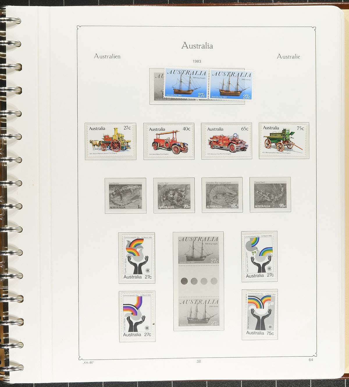 Collection in 5 hingeless KA-BE albums with slipcase. The star attraction are the albums, with hingeless pages ranging from 1913-1999, including spots for souvenir sheets and panes, and includes pages for Antarctica ranging from 1957 to 1999. The lot includes many hundreds of stamps, including a few used Kangaroos, and partially used sets up to the 1970's, along with scattered never hinged sets up to the early 1990's. We estimate face value material to be in the $80 to $100 range. A good starter collection in worthy albums that would have originally cost $1,000 in a retail environment. Estimate =