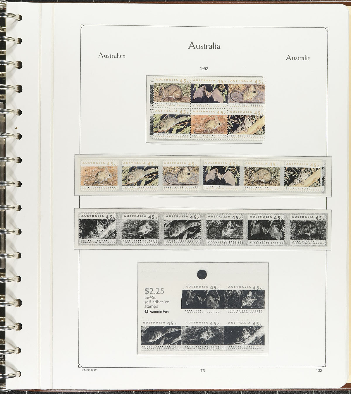 Collection in 5 hingeless KA-BE albums with slipcase. The star attraction are the albums, with hingeless pages ranging from 1913-1999, including spots for souvenir sheets and panes, and includes pages for Antarctica ranging from 1957 to 1999. The lot includes many hundreds of stamps, including a few used Kangaroos, and partially used sets up to the 1970's, along with scattered never hinged sets up to the early 1990's. We estimate face value material to be in the $80 to $100 range. A good starter collection in worthy albums that would have originally cost $1,000 in a retail environment. Estimate =