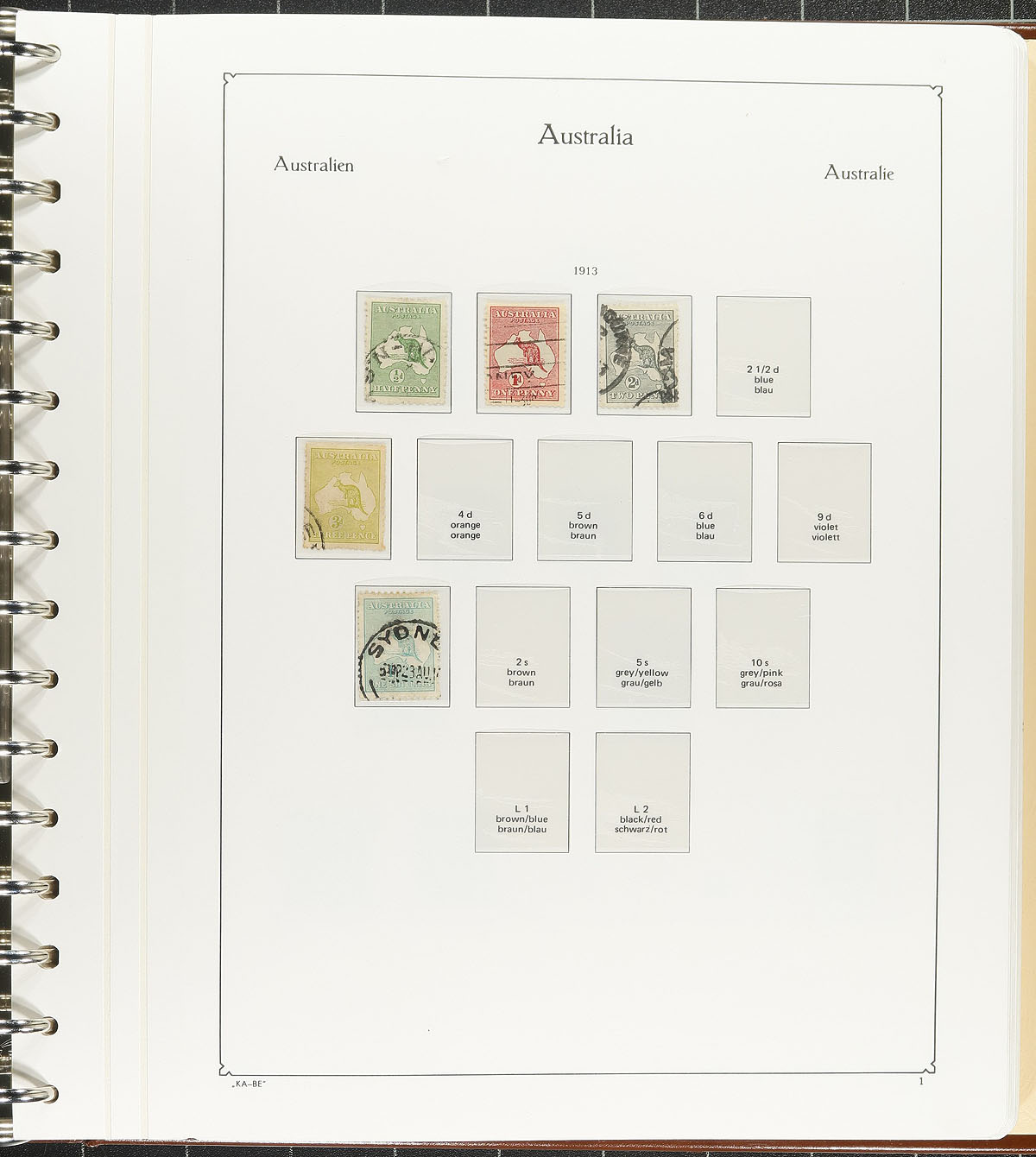 Collection in 5 hingeless KA-BE albums with slipcase. The star attraction are the albums, with hingeless pages ranging from 1913-1999, including spots for souvenir sheets and panes, and includes pages for Antarctica ranging from 1957 to 1999. The lot includes many hundreds of stamps, including a few used Kangaroos, and partially used sets up to the 1970's, along with scattered never hinged sets up to the early 1990's. We estimate face value material to be in the $80 to $100 range. A good starter collection in worthy albums that would have originally cost $1,000 in a retail environment. Estimate =