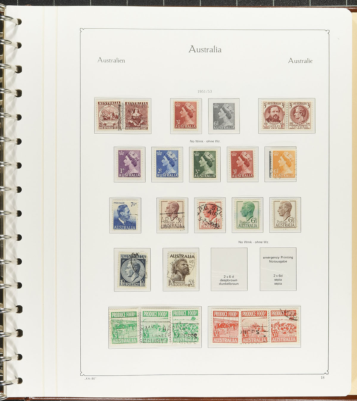 Collection in 5 hingeless KA-BE albums with slipcase. The star attraction are the albums, with hingeless pages ranging from 1913-1999, including spots for souvenir sheets and panes, and includes pages for Antarctica ranging from 1957 to 1999. The lot includes many hundreds of stamps, including a few used Kangaroos, and partially used sets up to the 1970's, along with scattered never hinged sets up to the early 1990's. We estimate face value material to be in the $80 to $100 range. A good starter collection in worthy albums that would have originally cost $1,000 in a retail environment. Estimate =