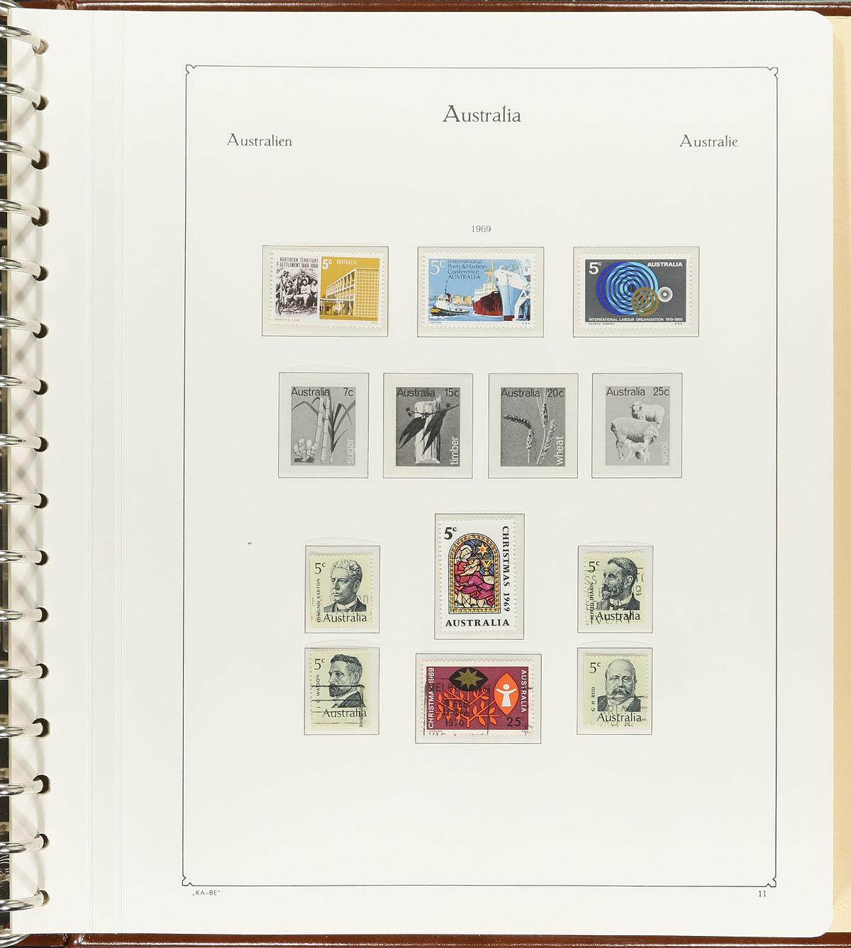 Collection in 5 hingeless KA-BE albums with slipcase. The star attraction are the albums, with hingeless pages ranging from 1913-1999, including spots for souvenir sheets and panes, and includes pages for Antarctica ranging from 1957 to 1999. The lot includes many hundreds of stamps, including a few used Kangaroos, and partially used sets up to the 1970's, along with scattered never hinged sets up to the early 1990's. We estimate face value material to be in the $80 to $100 range. A good starter collection in worthy albums that would have originally cost $1,000 in a retail environment. Estimate =
