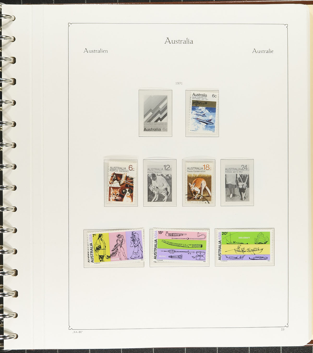 Collection in 5 hingeless KA-BE albums with slipcase. The star attraction are the albums, with hingeless pages ranging from 1913-1999, including spots for souvenir sheets and panes, and includes pages for Antarctica ranging from 1957 to 1999. The lot includes many hundreds of stamps, including a few used Kangaroos, and partially used sets up to the 1970's, along with scattered never hinged sets up to the early 1990's. We estimate face value material to be in the $80 to $100 range. A good starter collection in worthy albums that would have originally cost $1,000 in a retail environment. Estimate =