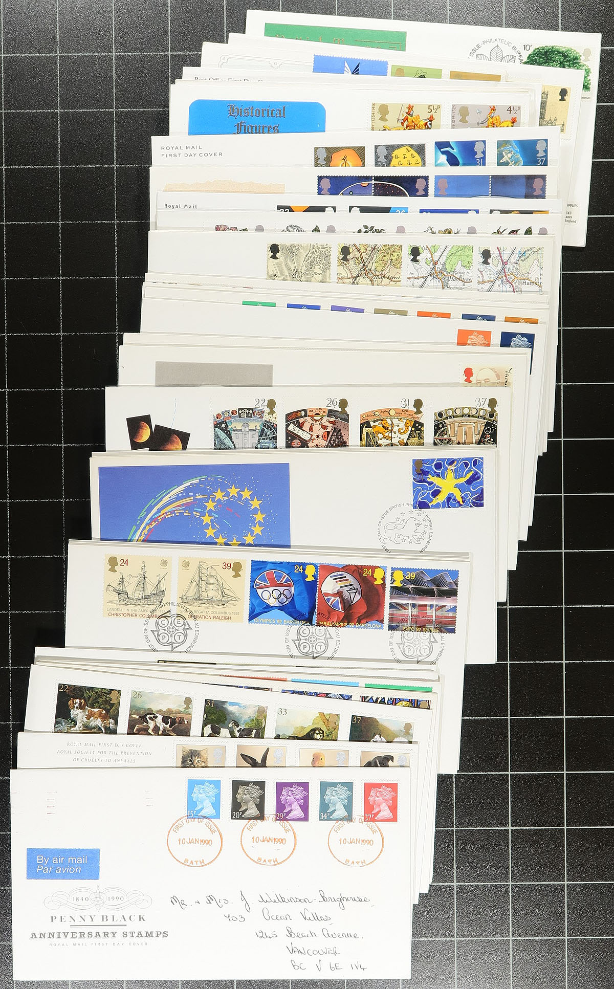 First Day Covers. Accumulation of Great Britain first day covers, 1960's-1990's, containing roughly 500 covers loose in a box, with a spot check indicating singles, primarily sets, and a few souvenir sheet frankings. Also included are Channel Islands, maximum cards, and a few event covers. A nice lot, with a few of the larger sized envelopes having a bit of corner bends. Overall fine to very fine. Estimate =