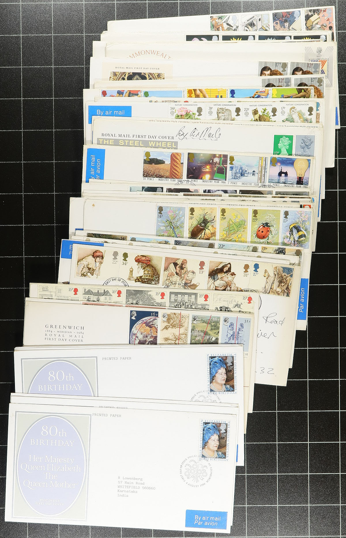 First Day Covers. Accumulation of Great Britain first day covers, 1960's-1990's, containing roughly 500 covers loose in a box, with a spot check indicating singles, primarily sets, and a few souvenir sheet frankings. Also included are Channel Islands, maximum cards, and a few event covers. A nice lot, with a few of the larger sized envelopes having a bit of corner bends. Overall fine to very fine. Estimate =