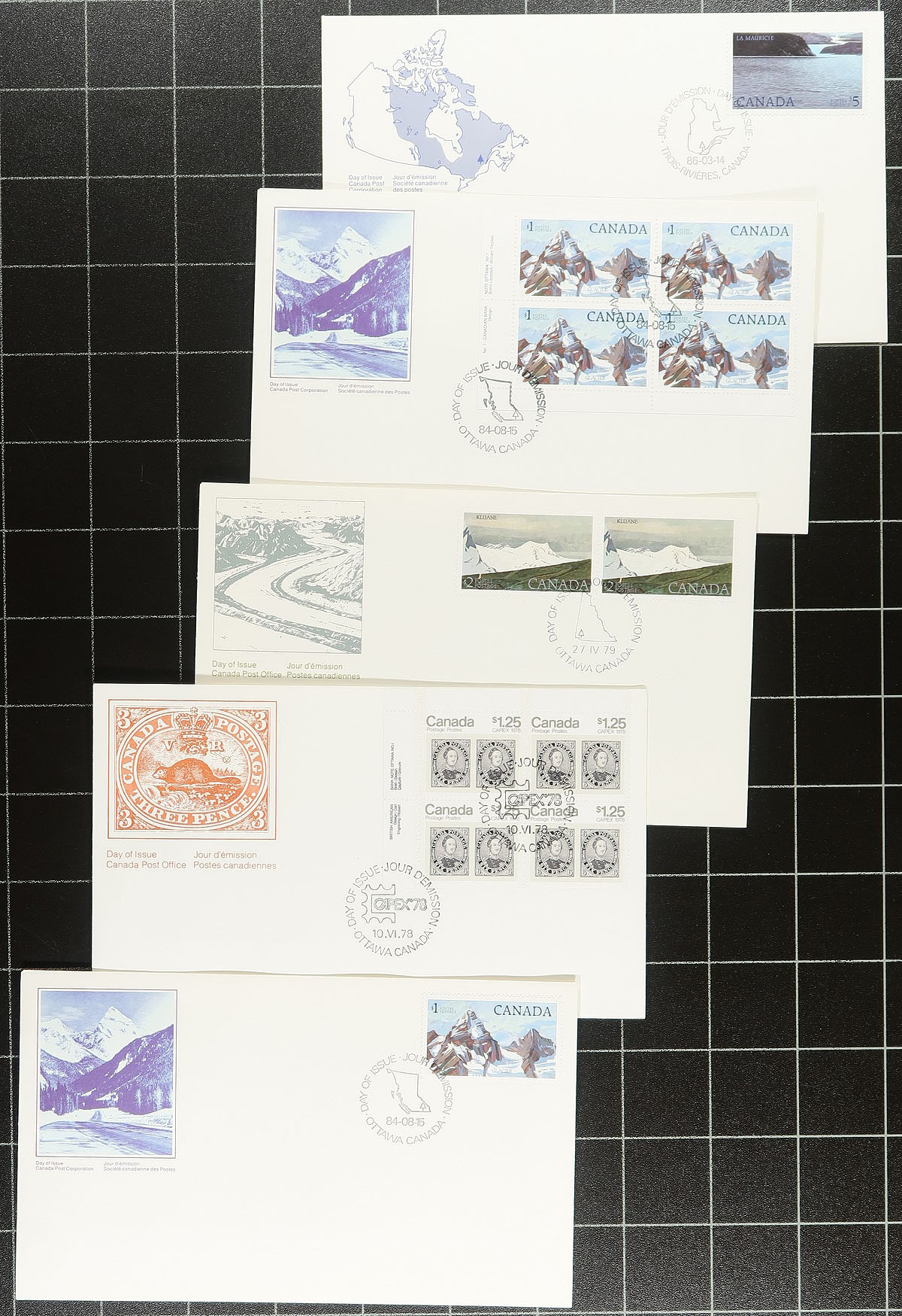First Day Covers. Collection of Canada first day covers, 1970's-1980's, containing roughly 450 covers in a box, noting singles, plate blocks, sets, and high denomination frankings. A spot check indicated some covers cataloguing $5 and up each, with mild duplication for some issues. A good lot for collectors and dealers alike. Estimate =