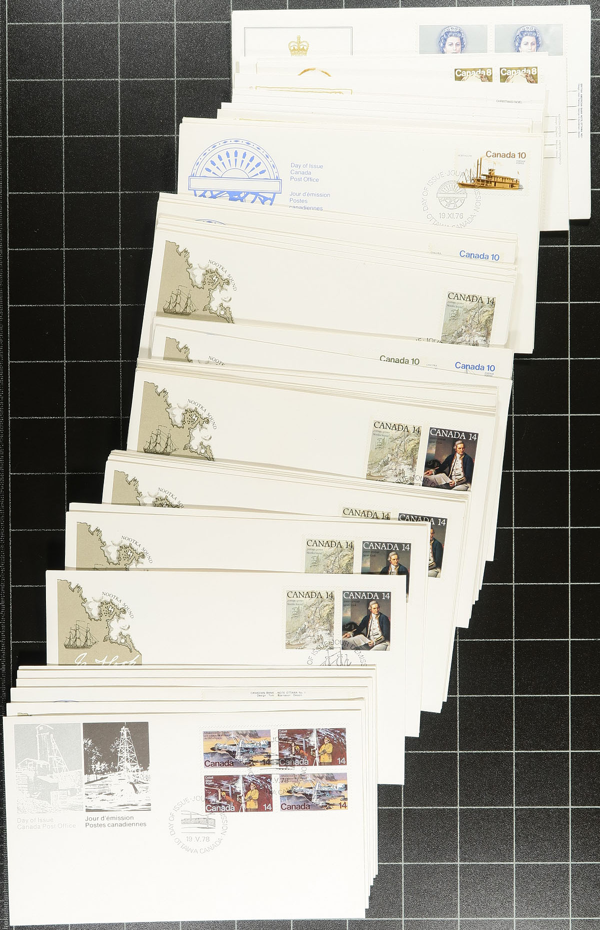 First Day Covers. Collection of Canada first day covers, 1970's-1980's, containing roughly 450 covers in a box, noting singles, plate blocks, sets, and high denomination frankings. A spot check indicated some covers cataloguing $5 and up each, with mild duplication for some issues. A good lot for collectors and dealers alike. Estimate =