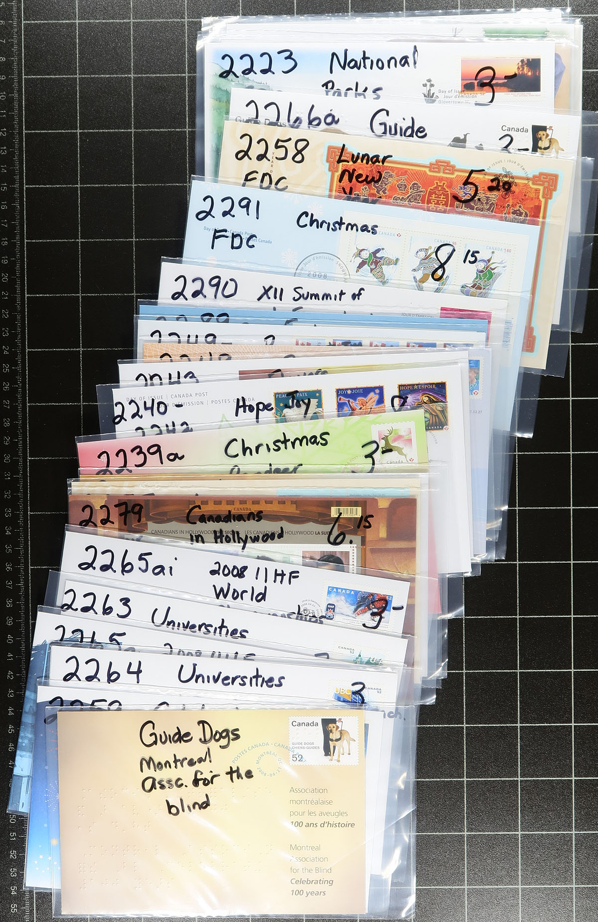 First Day Covers. Group of modern Canada first day covers, 2000-2008, loose in a box, with many covers sleeved with catalogue prices shown. We note singles, sets, souvenir sheet, and high denomination frankings, making this ideal for dealers and collectors alike. Very fine. Estimate =
