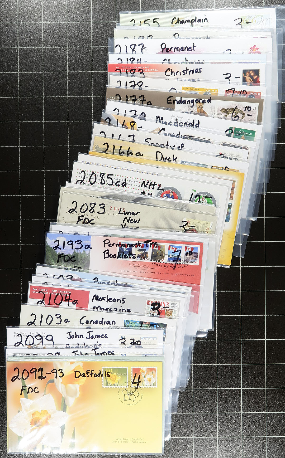 First Day Covers. Group of modern Canada first day covers, 2000-2008, loose in a box, with many covers sleeved with catalogue prices shown. We note singles, sets, souvenir sheet, and high denomination frankings, making this ideal for dealers and collectors alike. Very fine. Estimate =