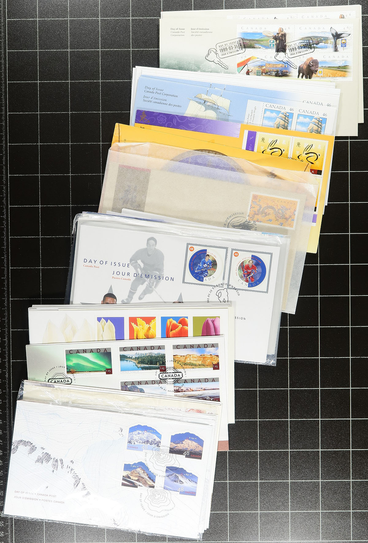 First Day Covers. Group of modern Canada first day covers, 2000-2008, loose in a box, with many covers sleeved with catalogue prices shown. We note singles, sets, souvenir sheet, and high denomination frankings, making this ideal for dealers and collectors alike. Very fine. Estimate =