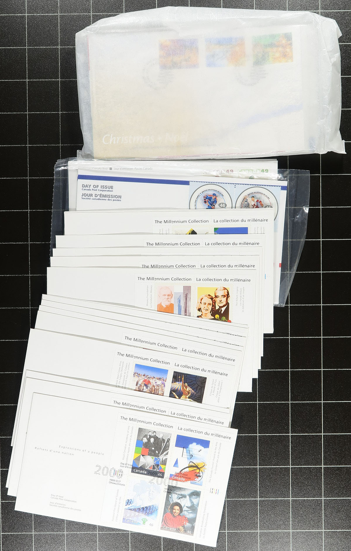 First Day Covers. Group of modern Canada first day covers, 2000-2008, loose in a box, with many covers sleeved with catalogue prices shown. We note singles, sets, souvenir sheet, and high denomination frankings, making this ideal for dealers and collectors alike. Very fine. Estimate =
