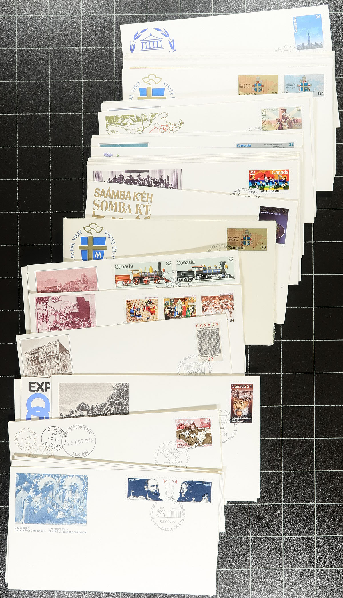 First Day Covers. Accumulation of Canada first day covers, 1970's-1990's, containing roughly 600 covers filling a box. A cursory check indicated singles, sets, coils, booklets, plate blocks, souvenir sheets, and high denomination frankings. Also included are uncacheted first days, postal stationery first days, and larger sized envelopes. Duplication generally ranges from 3 to 5 for some issues, still a nice group for dealers and collectors, overall fine to very fine. Estimate =