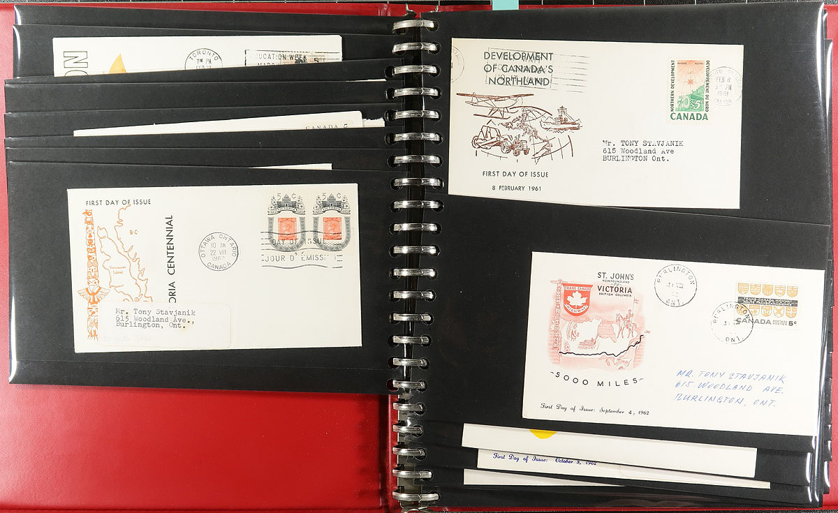 Lovely collection of private cachet Canada first day covers, 1962-1972, containing roughly 225 covers in 3 first day cover albums. We note primarily single frankings, along with a few blocks, noting some issues have both, and includes cachet makers Caneco, ARC, Rose Craft and Cole, with a few issues having a few different cachets. A lovely collection as most covers are in sparkling condition, ideal for collectors and dealers alike. Estimate =