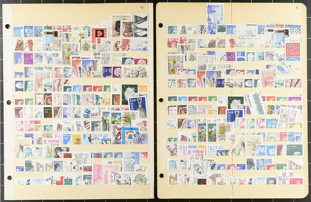 Collection / accumulation of used Sweden, 1891-2015, containing over 1,000 stamps in roughly 16 stock pages. The lot generally ranges from Scott #52/2745, noting singles, sets, partial sets, along with a few back of the book issues, and a decent selection of post-2000 issues. Owner's 2017 Scott catalogue value for the lot totals US$1,174.00. Postmark interest includes cds and pictorials, including some "socked on the nose" town cancels. A nice lot for all collectors. Estimate =