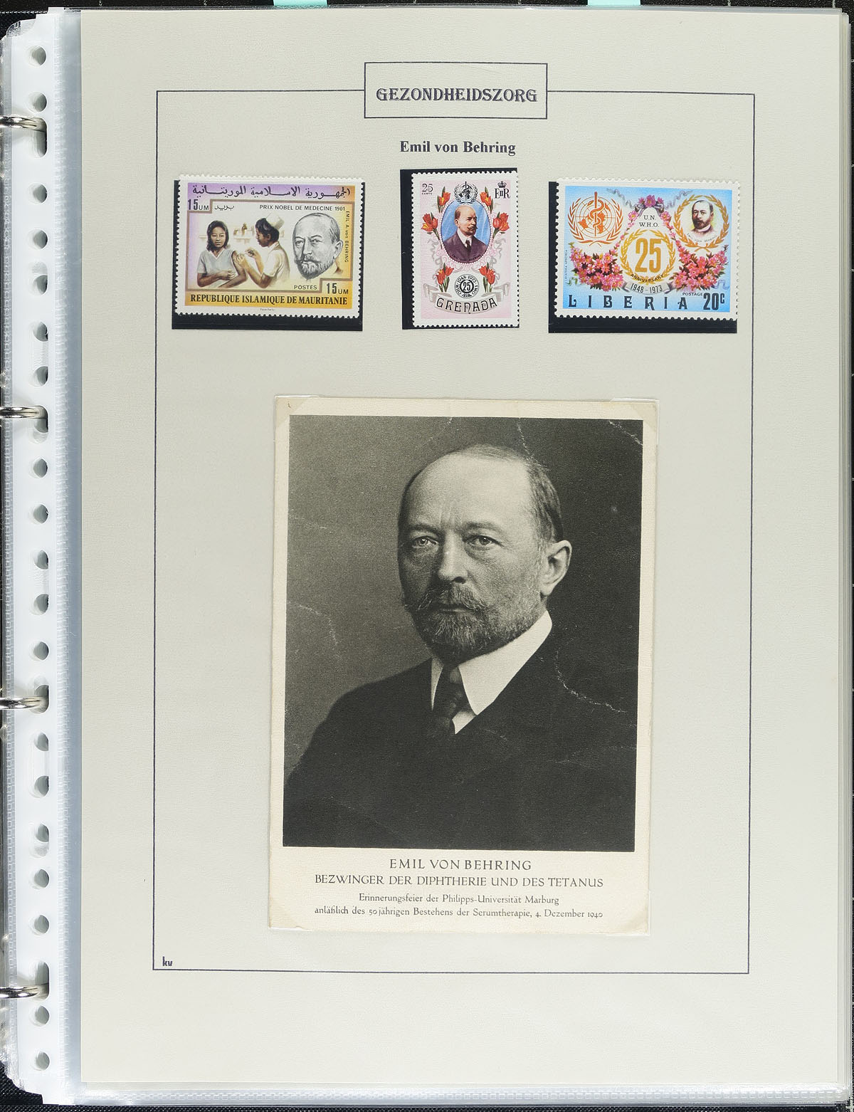 Medicine / Health Topical Collection. A lovely topical collection relating to health care in 3 volumes all with slipcases. This neatly organized collection contains many hundreds of items, including mint single and stamp sets, first day covers, souvenir sheets, all neatly displayed in an exhibit style format. The text is in German, but easily translatable through modern technology, noting a wide variety of health related topics including pharmacology, modern medicine, women's health, important figures and scientists, and more. A lovely collection that should be expanded and would make a lovely exhibit at any local or national show. Estimate =