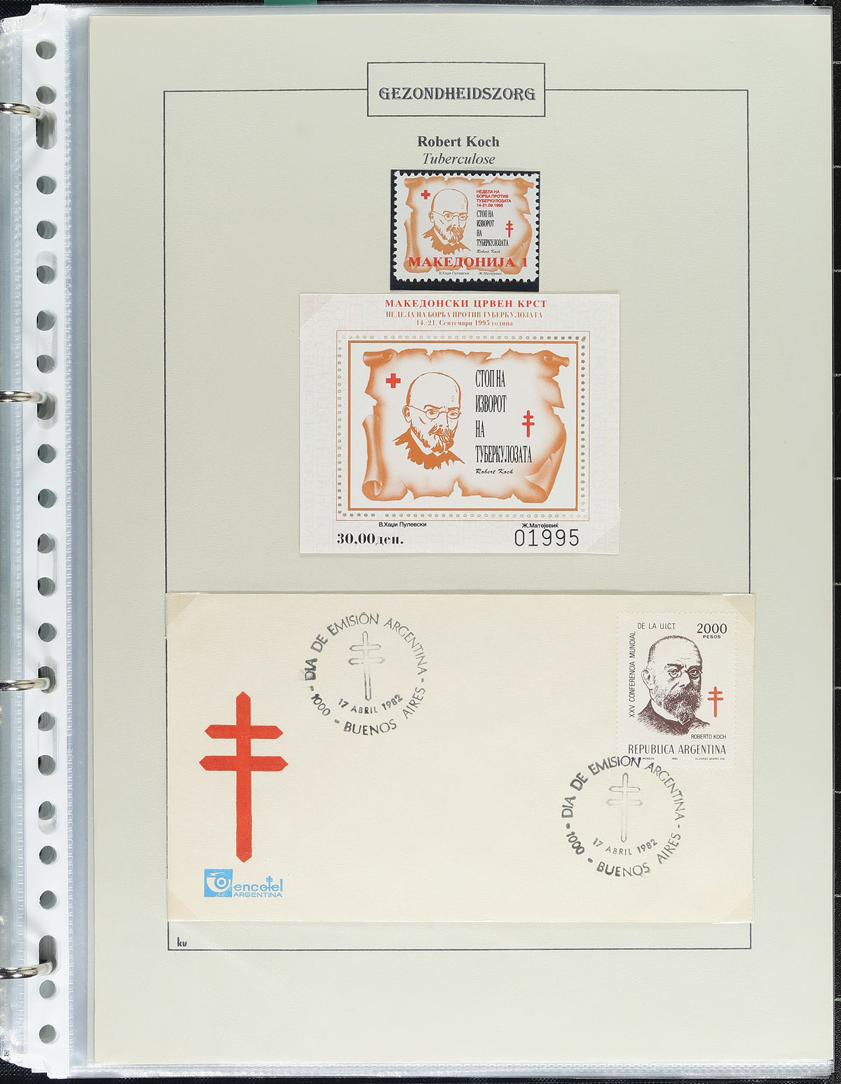 Medicine / Health Topical Collection. A lovely topical collection relating to health care in 3 volumes all with slipcases. This neatly organized collection contains many hundreds of items, including mint single and stamp sets, first day covers, souvenir sheets, all neatly displayed in an exhibit style format. The text is in German, but easily translatable through modern technology, noting a wide variety of health related topics including pharmacology, modern medicine, women's health, important figures and scientists, and more. A lovely collection that should be expanded and would make a lovely exhibit at any local or national show. Estimate =