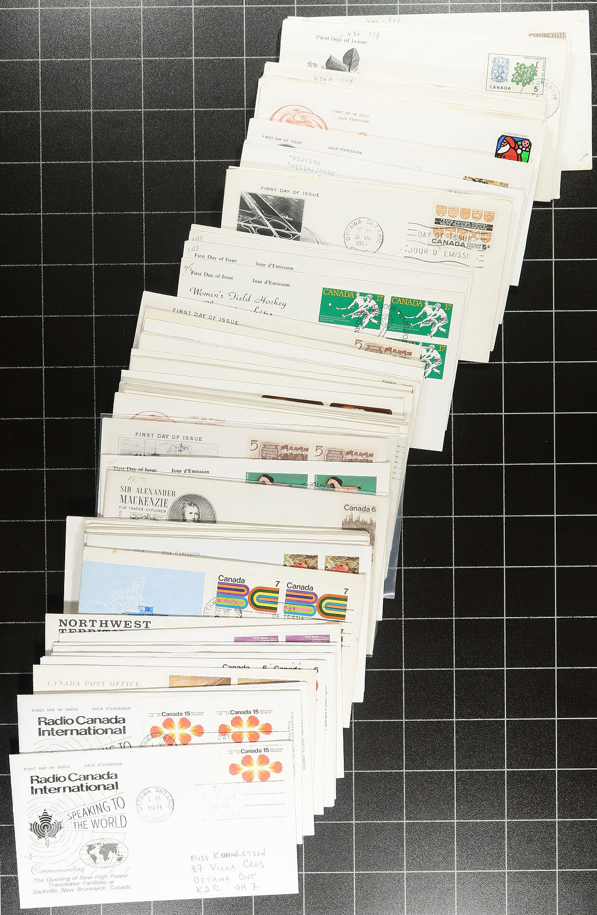 First Day Covers. Accumulation of roughly 500 Canada private cacheted first day covers, 1940's-1980, noting single, set, block, and a few high denomination frankings. We encountered mostly post-1972 covers with cachets made by Fleetwood and Kingswood, but also saw many earlier cachets by Rose Craft, Chickering-Jackson, and a few others. A nice group for collectors and dealers alike, noting a few small corner or edge bends on a few covers, overall fine to very fine. Estimate=