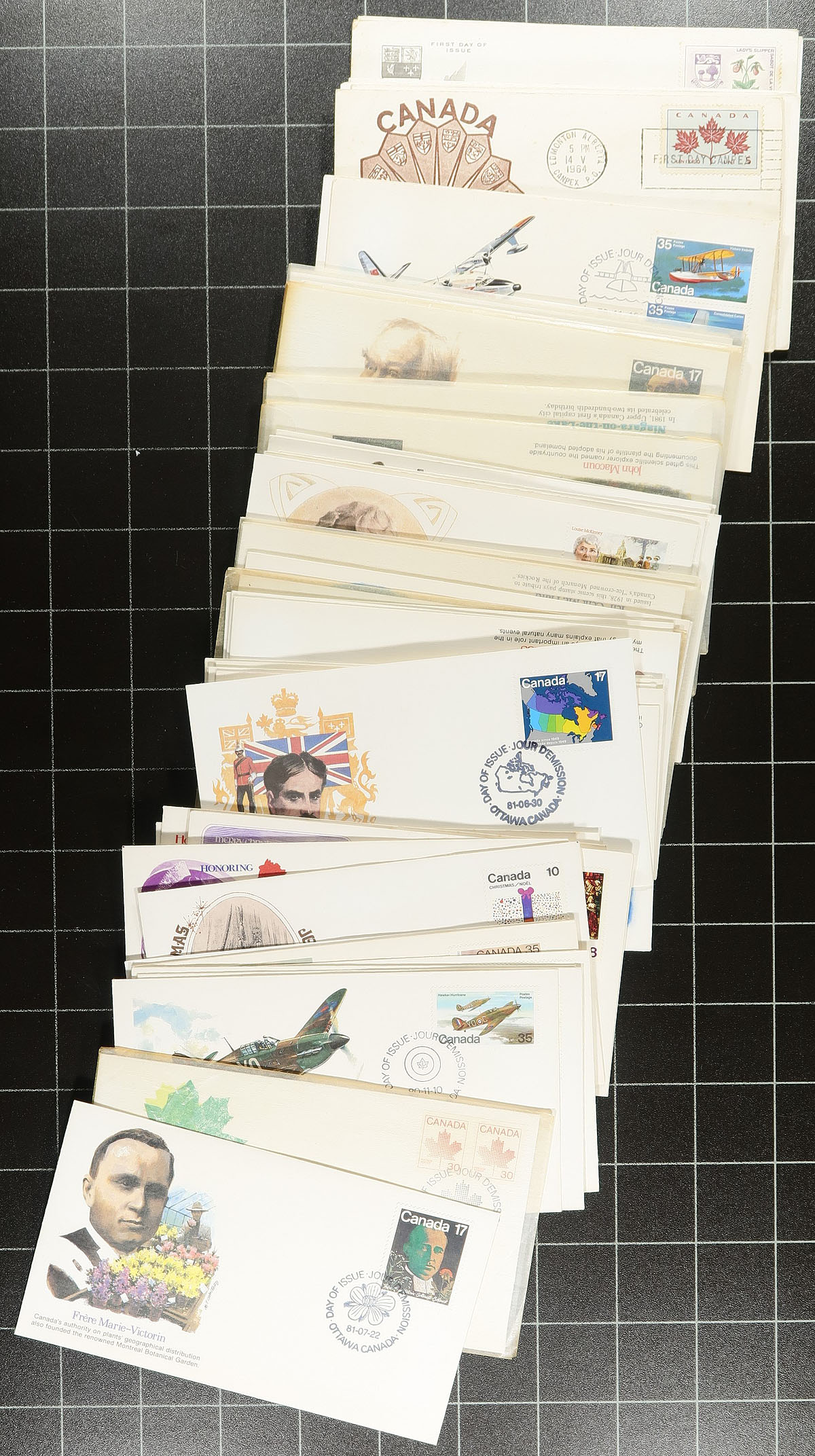 First Day Covers. Accumulation of roughly 500 Canada private cacheted first day covers, 1940's-1980, noting single, set, block, and a few high denomination frankings. We encountered mostly post-1972 covers with cachets made by Fleetwood and Kingswood, but also saw many earlier cachets by Rose Craft, Chickering-Jackson, and a few others. A nice group for collectors and dealers alike, noting a few small corner or edge bends on a few covers, overall fine to very fine. Estimate=