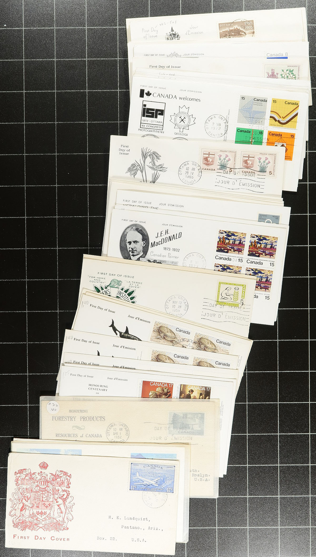 First Day Covers. Accumulation of roughly 500 Canada private cacheted first day covers, 1940's-1980, noting single, set, block, and a few high denomination frankings. We encountered mostly post-1972 covers with cachets made by Fleetwood and Kingswood, but also saw many earlier cachets by Rose Craft, Chickering-Jackson, and a few others. A nice group for collectors and dealers alike, noting a few small corner or edge bends on a few covers, overall fine to very fine. Estimate=