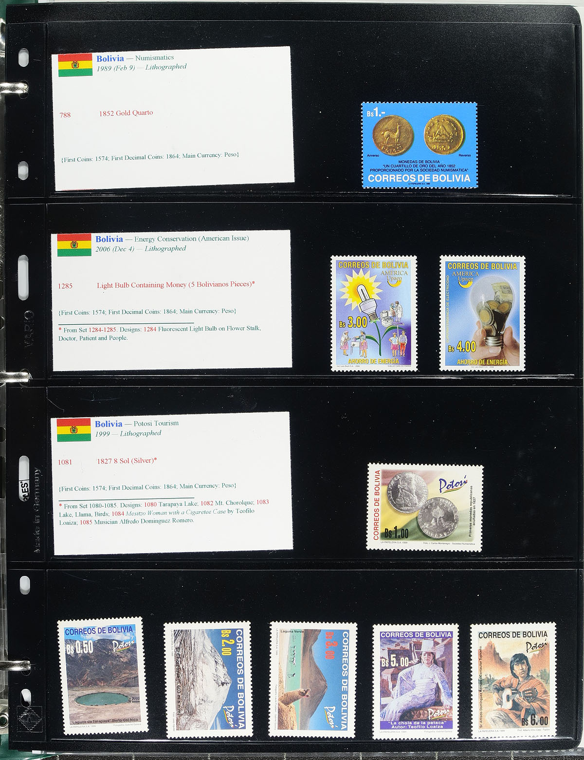 "Coins on Stamps" Part B. A lovely comprehensive topical collection containing countries ranging from B (Bolivia) to C (Colombia), containing a few hundred items with representation from 18 issuing countries or states. The collection contains mint or used singles, sets, souvenir sheets, first day covers, sheetlets and more, along with well researched text detailing the relationship between philately and numismatics, with each philatelic item well identified by Scott number along with additional printing information. Just a few of the better items in this volume with Scott #s China (Szechwan Province) F1, F3 (mint no gum $238 total), People's Republic of China 124-127 (mh, no gum, $67 total), along with a few items cataloguing $15 and up. Owner's older Scott catalogue value for the binder totals US$802.00. An exhibit worthy collection, and very fine. Estimate =