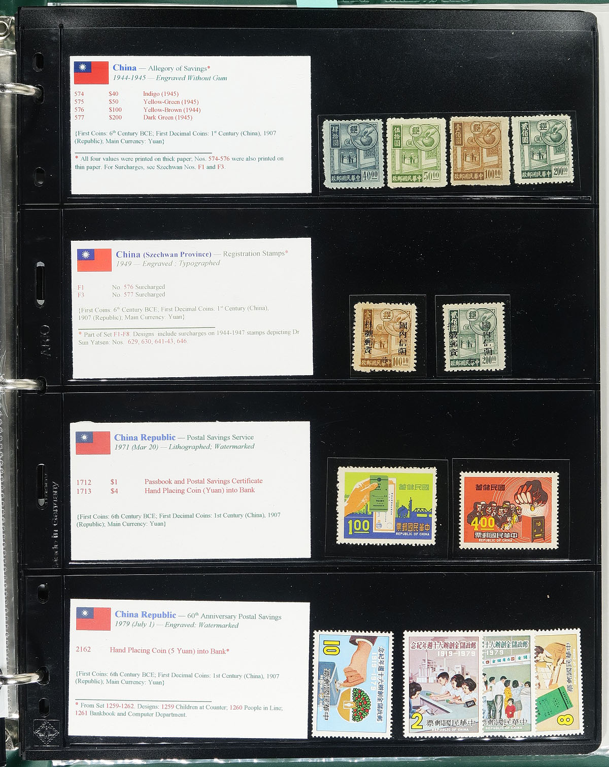 "Coins on Stamps" Part B. A lovely comprehensive topical collection containing countries ranging from B (Bolivia) to C (Colombia), containing a few hundred items with representation from 18 issuing countries or states. The collection contains mint or used singles, sets, souvenir sheets, first day covers, sheetlets and more, along with well researched text detailing the relationship between philately and numismatics, with each philatelic item well identified by Scott number along with additional printing information. Just a few of the better items in this volume with Scott #s China (Szechwan Province) F1, F3 (mint no gum $238 total), People's Republic of China 124-127 (mh, no gum, $67 total), along with a few items cataloguing $15 and up. Owner's older Scott catalogue value for the binder totals US$802.00. An exhibit worthy collection, and very fine. Estimate =