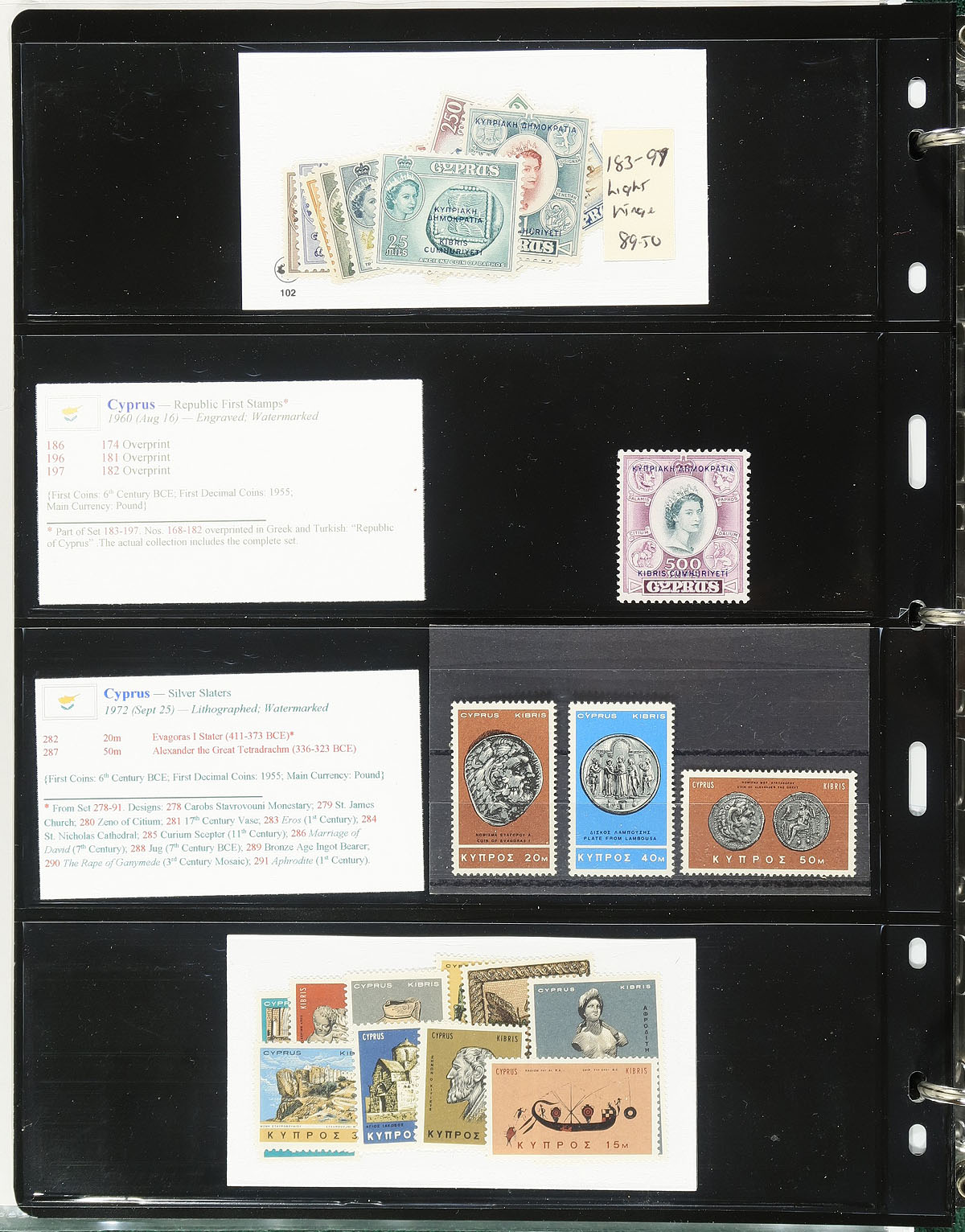"Coins on Stamps" PART C. Lovely comprehensive topical collection containing countries ranging from C (Congo Peoples Republic) to E (Ecuador), containing a few hundred items with representation from 16 issuing countries or states. The collection contains mint or used singles, sets, souvenir sheets, first day covers, sheetlets and more, along with well researched text detailing the relationship between philately and numismatics, with each philatelic item well identified by Scott number along with additional printing information. Just a few of the better items in this volume with Scott #s Crete 92 (mh, $97), 118 (used, $100), Cyprus 168-182 (lh, $130 total), 183-197 (lh, $152 total), along with a few items cataloguing $15 and up. Owner's older Scott catalogue value for the binder totals US$1,282.00. An exhibit worthy collection, and very fine. Estimate =