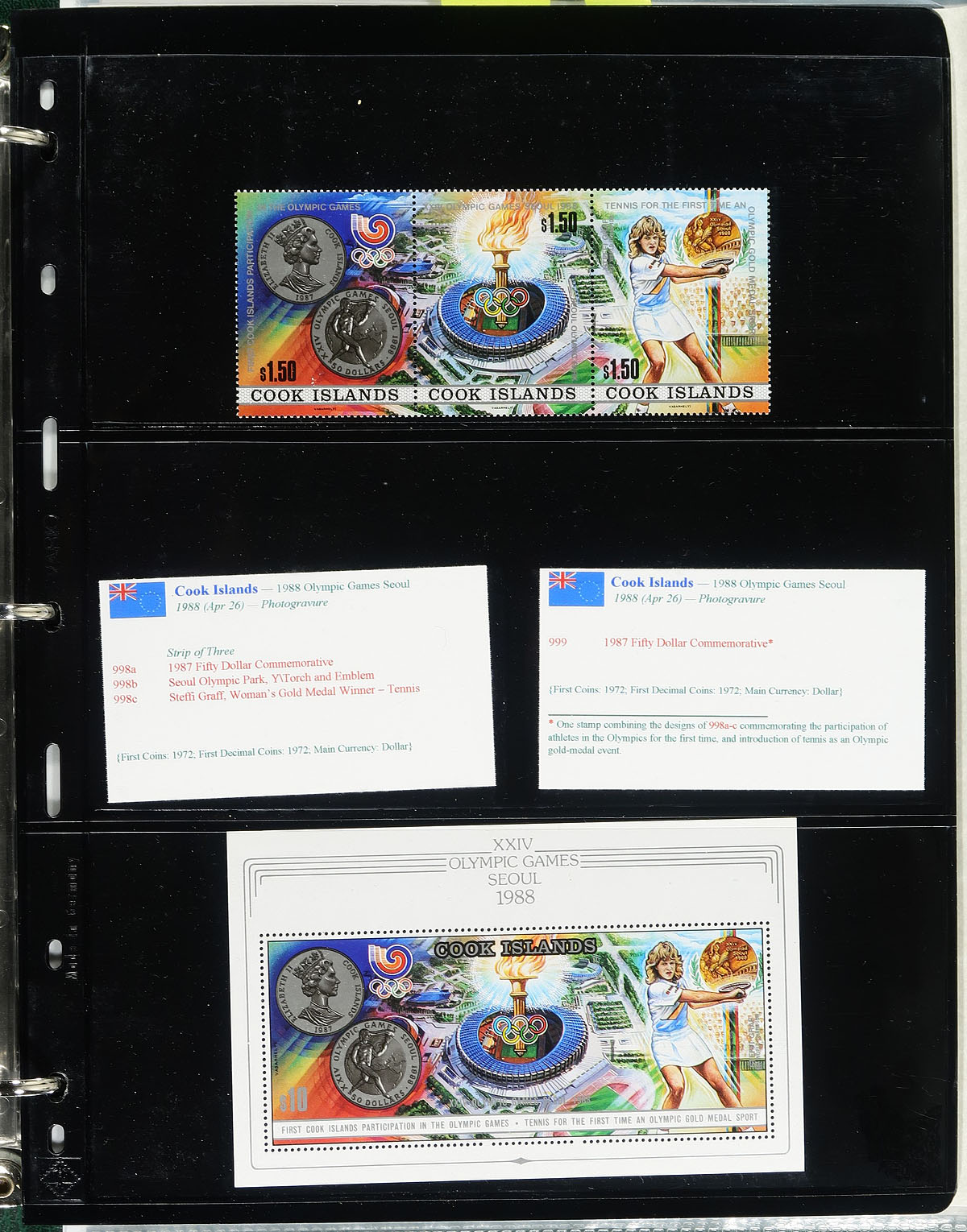 "Coins on Stamps" PART C. Lovely comprehensive topical collection containing countries ranging from C (Congo Peoples Republic) to E (Ecuador), containing a few hundred items with representation from 16 issuing countries or states. The collection contains mint or used singles, sets, souvenir sheets, first day covers, sheetlets and more, along with well researched text detailing the relationship between philately and numismatics, with each philatelic item well identified by Scott number along with additional printing information. Just a few of the better items in this volume with Scott #s Crete 92 (mh, $97), 118 (used, $100), Cyprus 168-182 (lh, $130 total), 183-197 (lh, $152 total), along with a few items cataloguing $15 and up. Owner's older Scott catalogue value for the binder totals US$1,282.00. An exhibit worthy collection, and very fine. Estimate =
