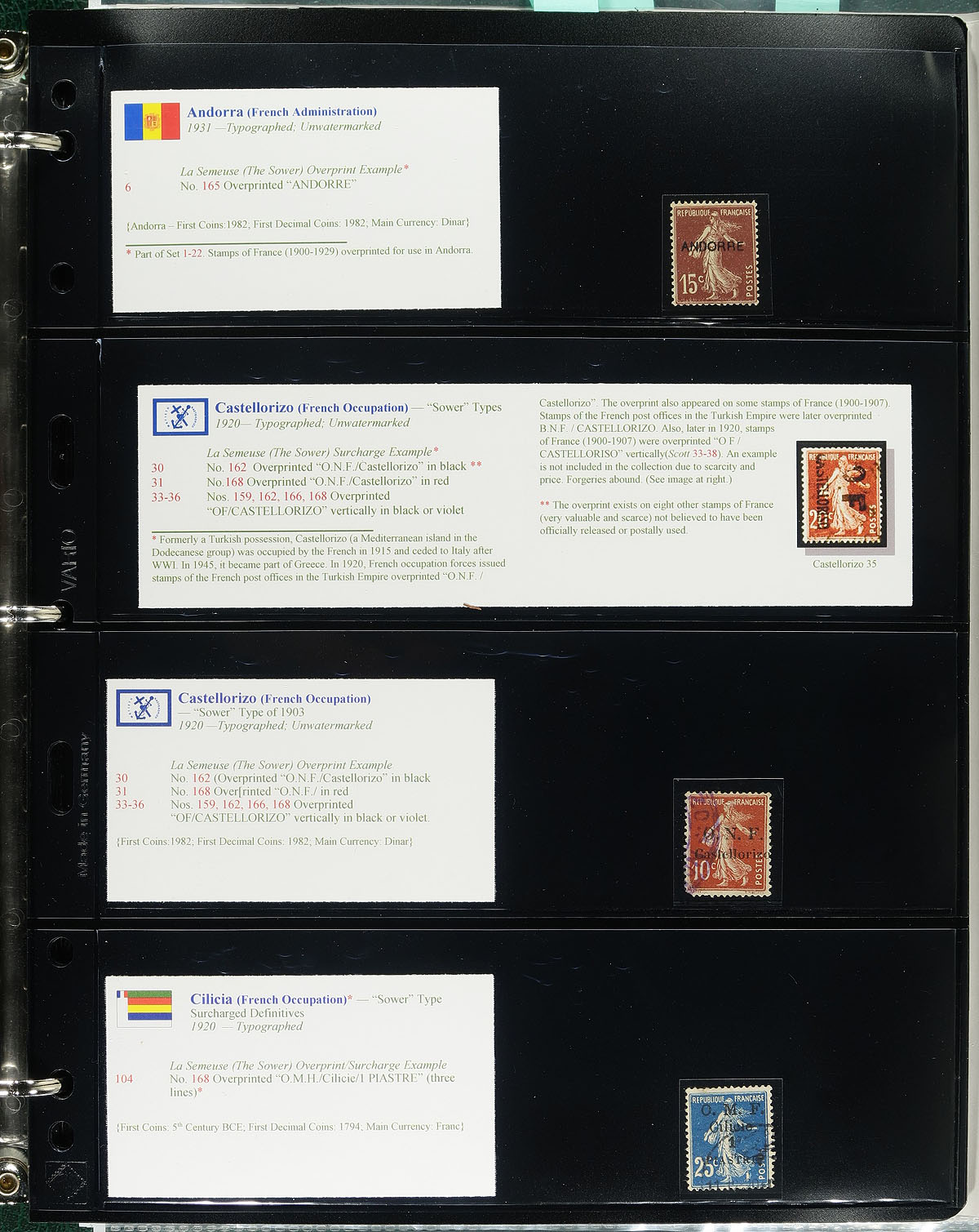 "Coins on Stamps" PART D. Lovely comprehensive topical collection containing countries ranging from E (Egypt) to G (Guernsey), containing a few hundred items with representation from 30 issuing countries or states including France and colonies overprints (note Great Britain and Greece are in PART E). The collection contains mint or used singles, sets, souvenir sheets, first day covers, sheetlets and more, along with well researched text detailing the relationship between philately and numismatics, with each philatelic item well identified by Scott number along with additional printing information. Just a few of the better items in this volume with Scott #s Epirus 42-56 (mh, $37 total), France 163 (SPECIMEN overprint), Castellorizo 30 (used, $65), along with some items cataloguing $15 to $30 and up. Owner's older Scott catalogue value for the binder totals US$1,436.00. An exhibit worthy collection, and very fine. Estimate =