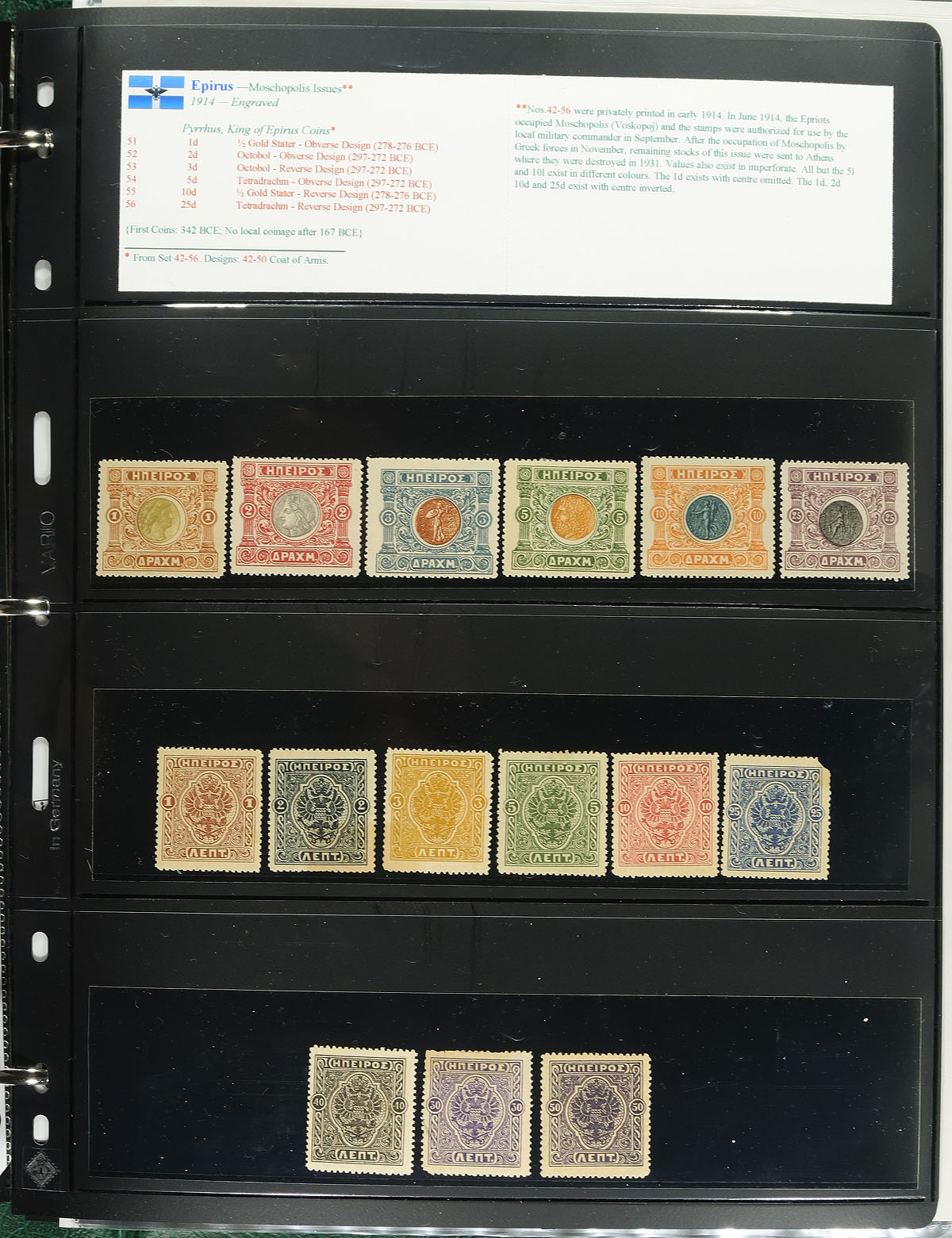 "Coins on Stamps" PART D. Lovely comprehensive topical collection containing countries ranging from E (Egypt) to G (Guernsey), containing a few hundred items with representation from 30 issuing countries or states including France and colonies overprints (note Great Britain and Greece are in PART E). The collection contains mint or used singles, sets, souvenir sheets, first day covers, sheetlets and more, along with well researched text detailing the relationship between philately and numismatics, with each philatelic item well identified by Scott number along with additional printing information. Just a few of the better items in this volume with Scott #s Epirus 42-56 (mh, $37 total), France 163 (SPECIMEN overprint), Castellorizo 30 (used, $65), along with some items cataloguing $15 to $30 and up. Owner's older Scott catalogue value for the binder totals US$1,436.00. An exhibit worthy collection, and very fine. Estimate =