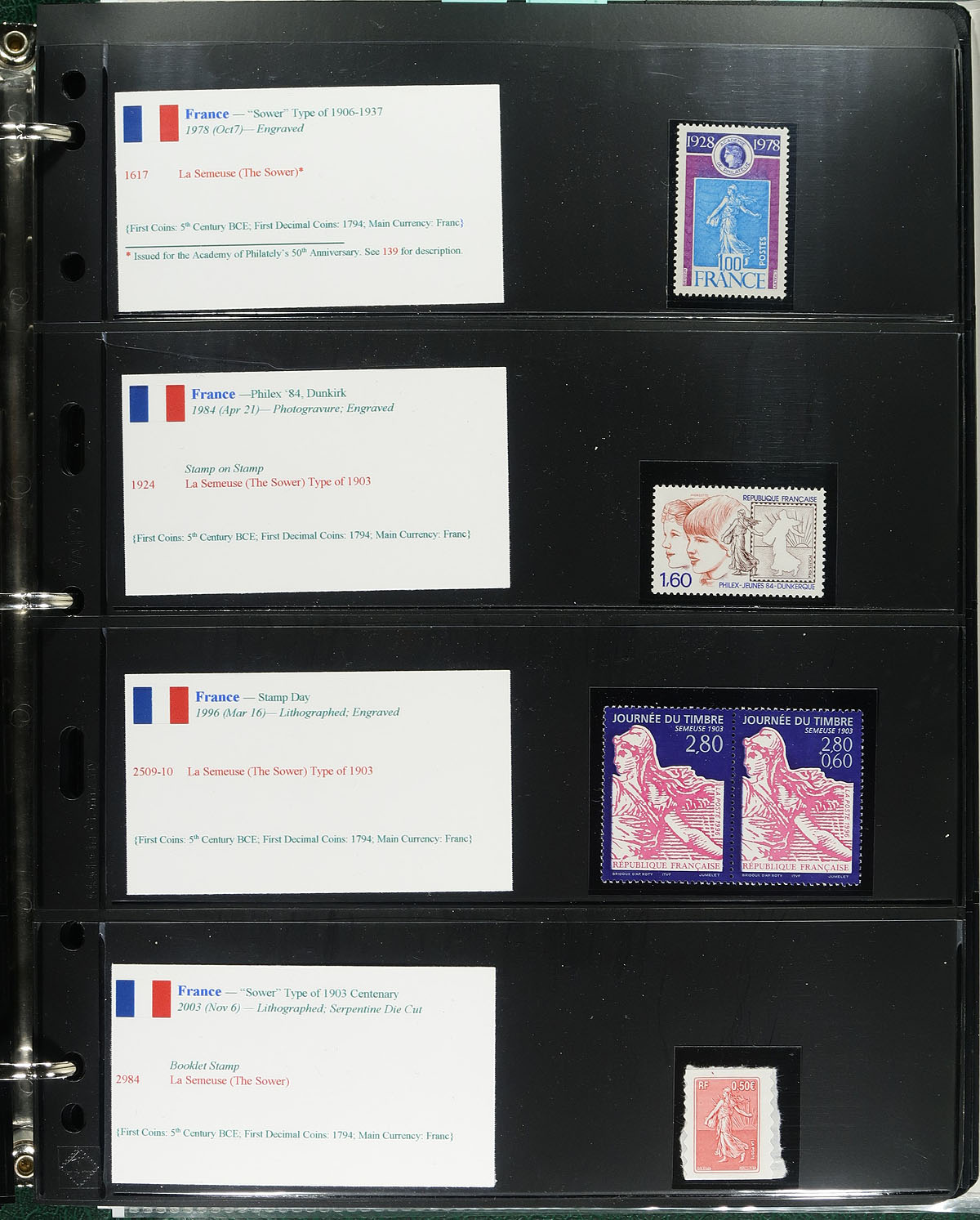 "Coins on Stamps" PART D. Lovely comprehensive topical collection containing countries ranging from E (Egypt) to G (Guernsey), containing a few hundred items with representation from 30 issuing countries or states including France and colonies overprints (note Great Britain and Greece are in PART E). The collection contains mint or used singles, sets, souvenir sheets, first day covers, sheetlets and more, along with well researched text detailing the relationship between philately and numismatics, with each philatelic item well identified by Scott number along with additional printing information. Just a few of the better items in this volume with Scott #s Epirus 42-56 (mh, $37 total), France 163 (SPECIMEN overprint), Castellorizo 30 (used, $65), along with some items cataloguing $15 to $30 and up. Owner's older Scott catalogue value for the binder totals US$1,436.00. An exhibit worthy collection, and very fine. Estimate =