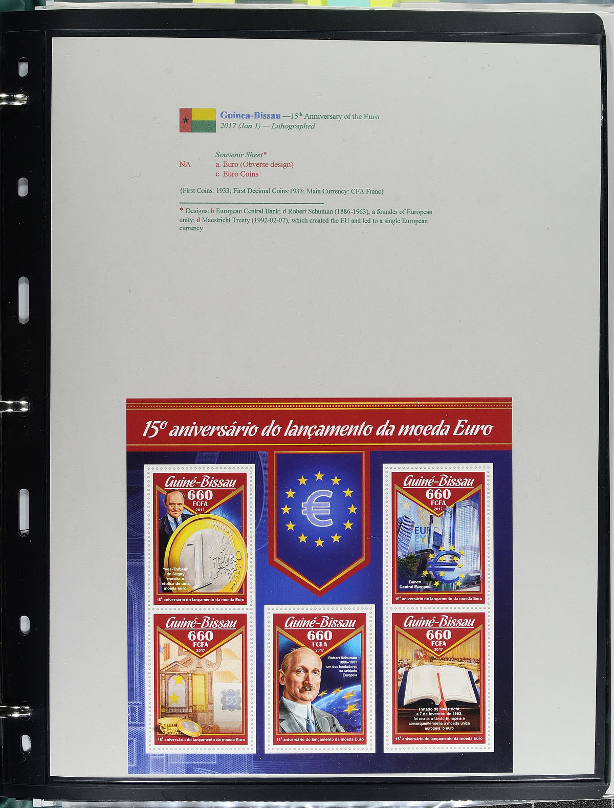 "Coins on Stamps" PART E. Lovely comprehensive topical collection containing countries ranging from G (Great Britian) to I (Iraq), containing a few hundred items with representation from 11 issuing countries or states. The collection contains mint or used singles, sets, souvenir sheets, first day covers, sheetlets and more, along with well researched text detailing the relationship between philately and numismatics, with each philatelic item well identified by Scott number along with additional printing information. Just a few of the better items in this volume with Scott #s Great Britain Penny Black 1 (used, 3 margins, plate letters LL, $375), Greece 639-648 (nh, $48 total), along with a few items cataloguing $15 and up. Owner's older Scott catalogue value for the binder totals US$1,056.00. An exhibit worthy collection, and very fine. Estimate =