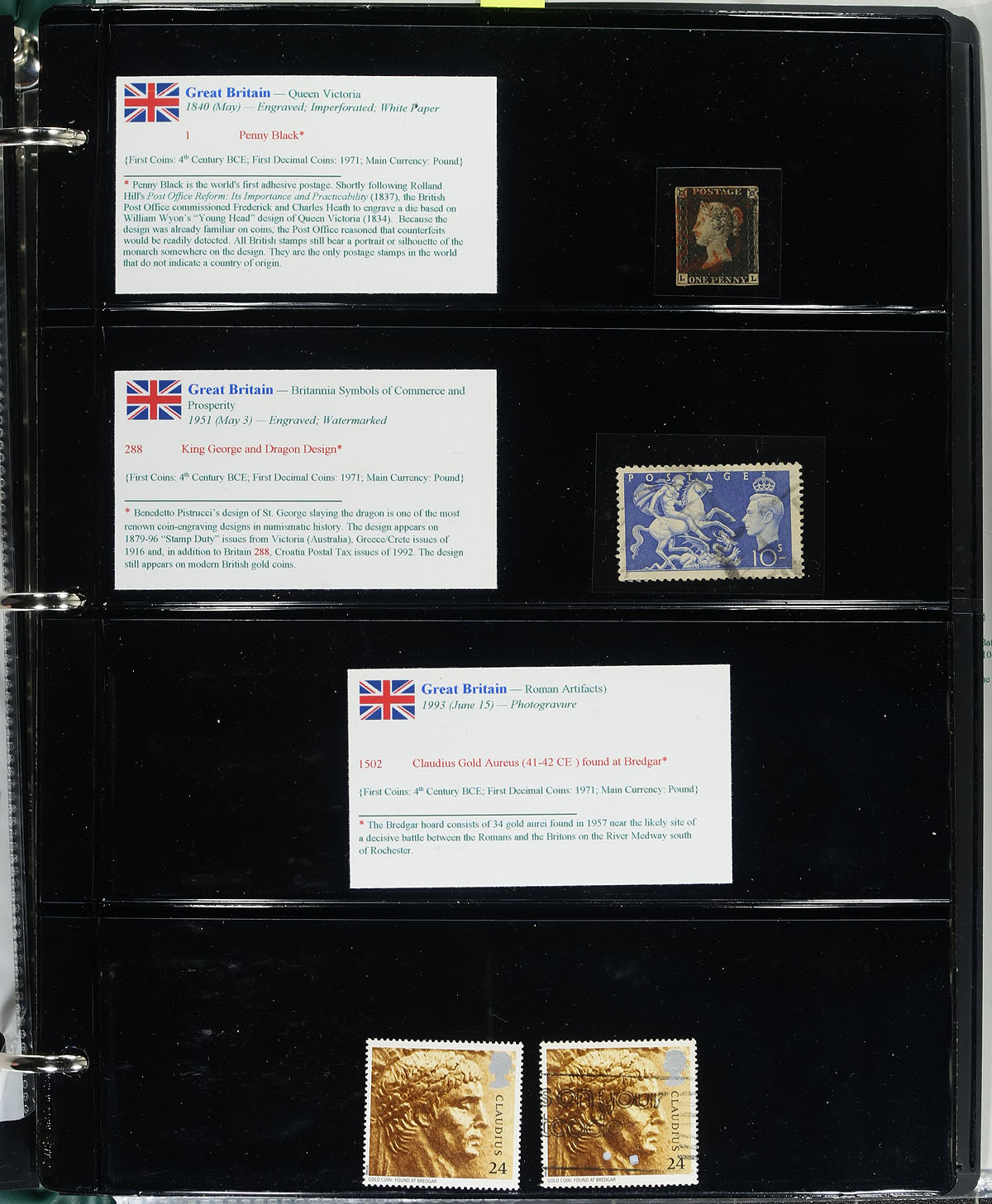 "Coins on Stamps" PART E. Lovely comprehensive topical collection containing countries ranging from G (Great Britian) to I (Iraq), containing a few hundred items with representation from 11 issuing countries or states. The collection contains mint or used singles, sets, souvenir sheets, first day covers, sheetlets and more, along with well researched text detailing the relationship between philately and numismatics, with each philatelic item well identified by Scott number along with additional printing information. Just a few of the better items in this volume with Scott #s Great Britain Penny Black 1 (used, 3 margins, plate letters LL, $375), Greece 639-648 (nh, $48 total), along with a few items cataloguing $15 and up. Owner's older Scott catalogue value for the binder totals US$1,056.00. An exhibit worthy collection, and very fine. Estimate =