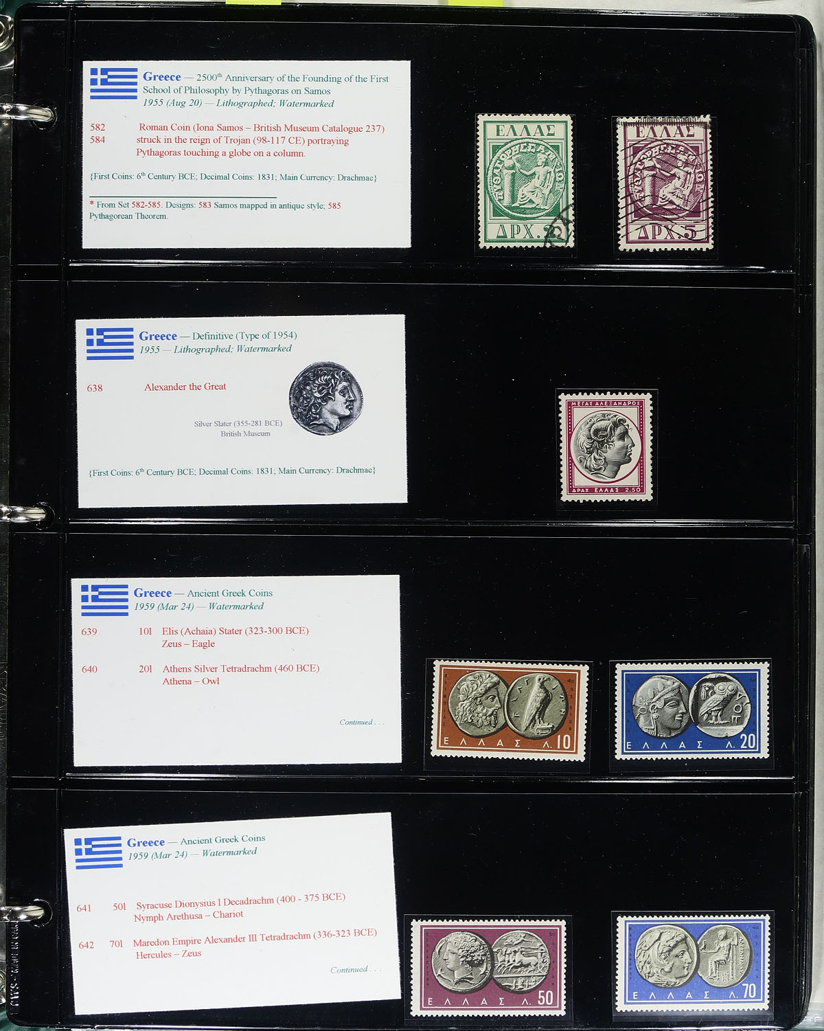 "Coins on Stamps" PART E. Lovely comprehensive topical collection containing countries ranging from G (Great Britian) to I (Iraq), containing a few hundred items with representation from 11 issuing countries or states. The collection contains mint or used singles, sets, souvenir sheets, first day covers, sheetlets and more, along with well researched text detailing the relationship between philately and numismatics, with each philatelic item well identified by Scott number along with additional printing information. Just a few of the better items in this volume with Scott #s Great Britain Penny Black 1 (used, 3 margins, plate letters LL, $375), Greece 639-648 (nh, $48 total), along with a few items cataloguing $15 and up. Owner's older Scott catalogue value for the binder totals US$1,056.00. An exhibit worthy collection, and very fine. Estimate =
