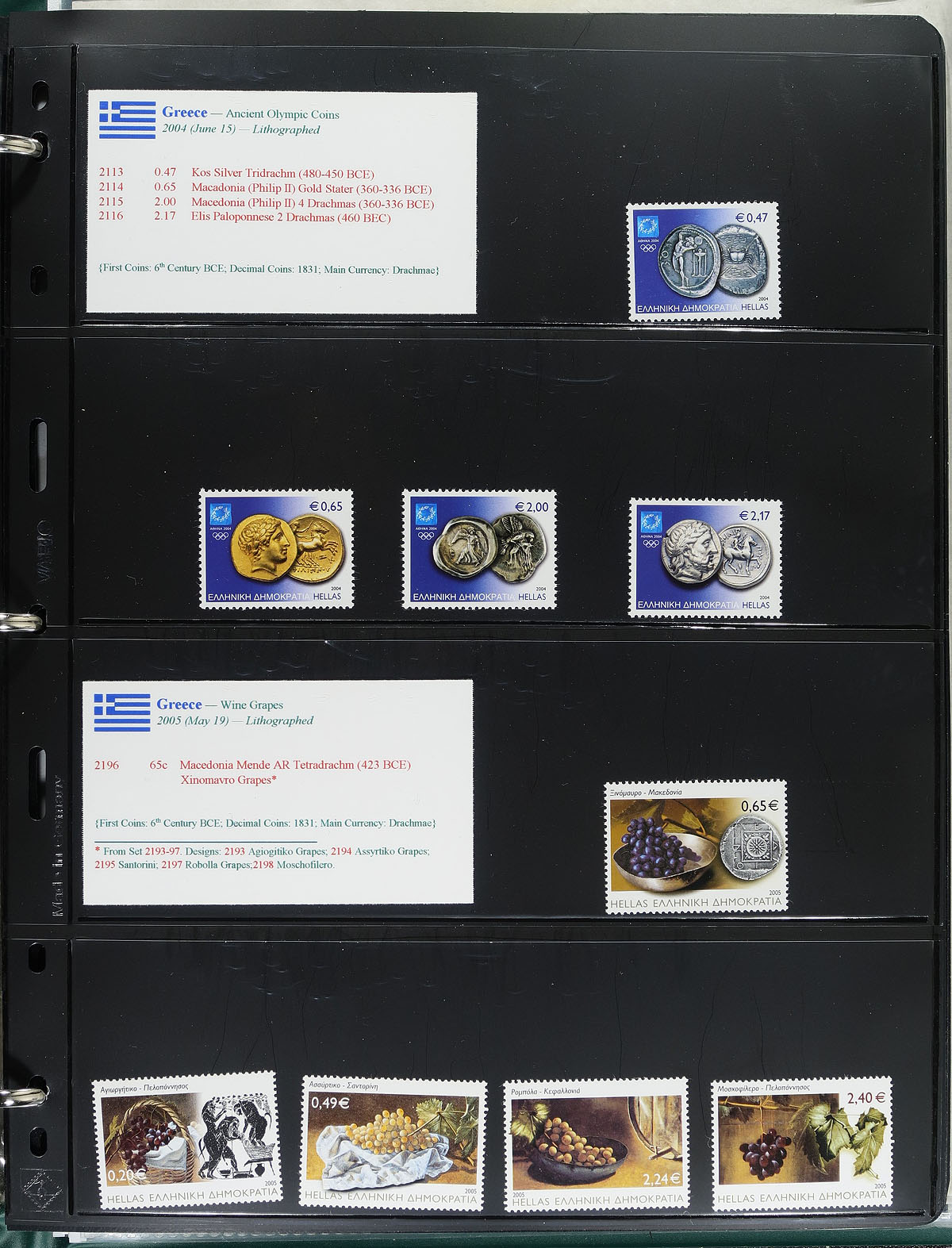 "Coins on Stamps" PART E. Lovely comprehensive topical collection containing countries ranging from G (Great Britian) to I (Iraq), containing a few hundred items with representation from 11 issuing countries or states. The collection contains mint or used singles, sets, souvenir sheets, first day covers, sheetlets and more, along with well researched text detailing the relationship between philately and numismatics, with each philatelic item well identified by Scott number along with additional printing information. Just a few of the better items in this volume with Scott #s Great Britain Penny Black 1 (used, 3 margins, plate letters LL, $375), Greece 639-648 (nh, $48 total), along with a few items cataloguing $15 and up. Owner's older Scott catalogue value for the binder totals US$1,056.00. An exhibit worthy collection, and very fine. Estimate =