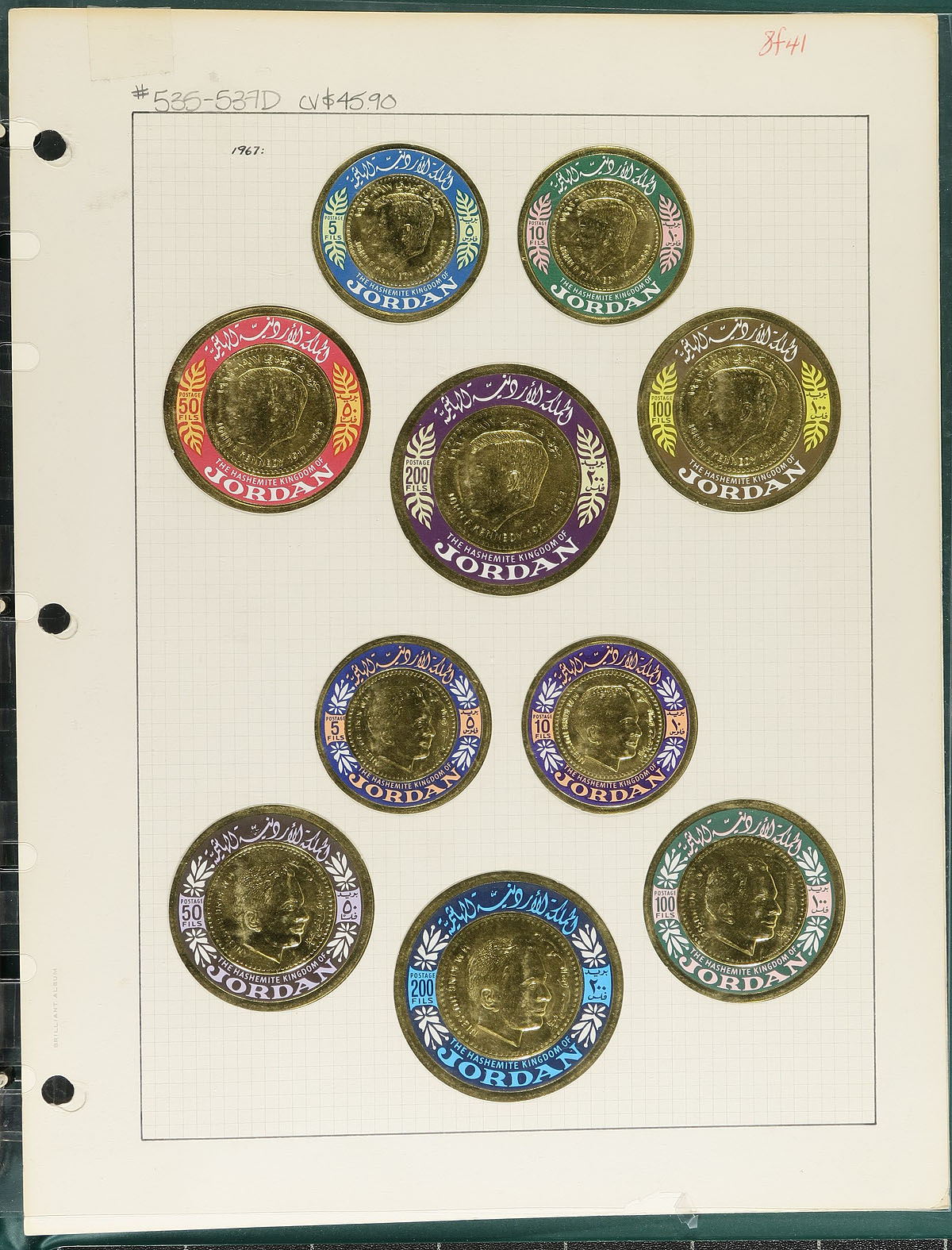 "Coins on Stamps" PART F. Lovely comprehensive topical collection containing countries ranging from I (Ireland) to J (Jordan), containing a few hundred items with representation from 10 issuing countries or states. The collection contains mint or used singles, sets, souvenir sheets, first day covers, sheetlets and more, along with well researched text detailing the relationship between philately and numismatics, with each philatelic item well identified by Scott number along with additional printing information. Just a few of the better items in this volume with Scott #s Israel 1-9 no tabs (nh, $387 total), 16 souvenir sheet (mh, $90), Italy-Trieste EY3 (nh, $80), Jordan 535-537D (mh, $51 total) along with a few items cataloguing $15 and up. Owner's older Scott catalogue value for the binder totals US$1,139.00. An exhibit worthy collection, and very fine. Estimate =