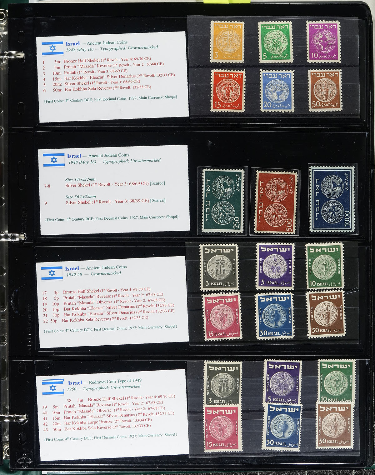 "Coins on Stamps" PART F. Lovely comprehensive topical collection containing countries ranging from I (Ireland) to J (Jordan), containing a few hundred items with representation from 10 issuing countries or states. The collection contains mint or used singles, sets, souvenir sheets, first day covers, sheetlets and more, along with well researched text detailing the relationship between philately and numismatics, with each philatelic item well identified by Scott number along with additional printing information. Just a few of the better items in this volume with Scott #s Israel 1-9 no tabs (nh, $387 total), 16 souvenir sheet (mh, $90), Italy-Trieste EY3 (nh, $80), Jordan 535-537D (mh, $51 total) along with a few items cataloguing $15 and up. Owner's older Scott catalogue value for the binder totals US$1,139.00. An exhibit worthy collection, and very fine. Estimate =