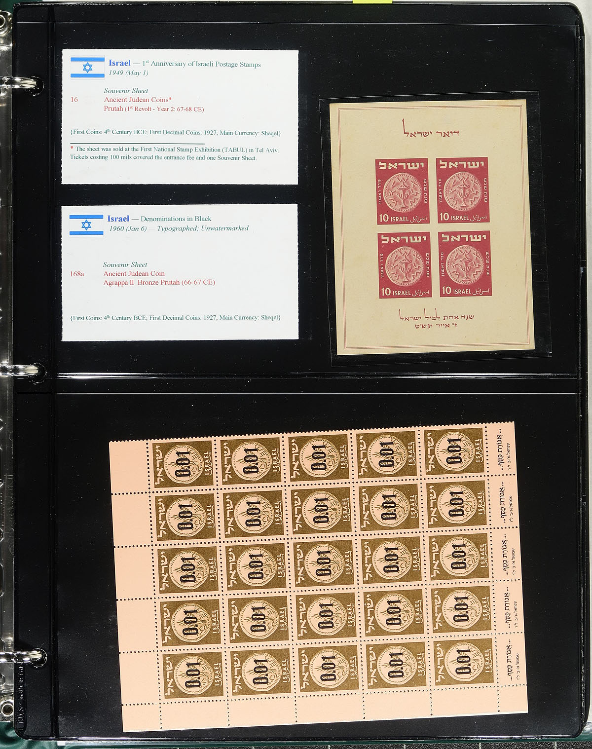 "Coins on Stamps" PART F. Lovely comprehensive topical collection containing countries ranging from I (Ireland) to J (Jordan), containing a few hundred items with representation from 10 issuing countries or states. The collection contains mint or used singles, sets, souvenir sheets, first day covers, sheetlets and more, along with well researched text detailing the relationship between philately and numismatics, with each philatelic item well identified by Scott number along with additional printing information. Just a few of the better items in this volume with Scott #s Israel 1-9 no tabs (nh, $387 total), 16 souvenir sheet (mh, $90), Italy-Trieste EY3 (nh, $80), Jordan 535-537D (mh, $51 total) along with a few items cataloguing $15 and up. Owner's older Scott catalogue value for the binder totals US$1,139.00. An exhibit worthy collection, and very fine. Estimate =